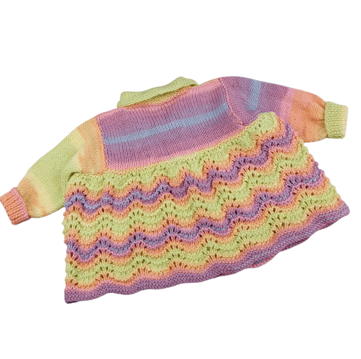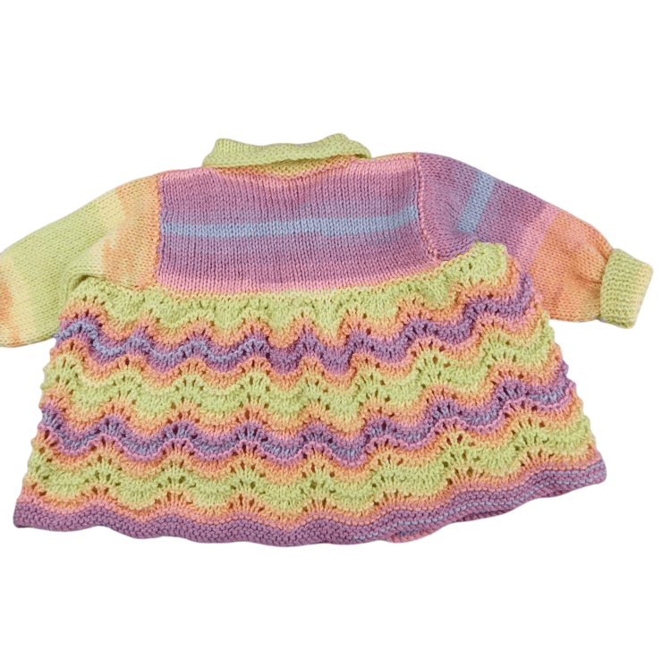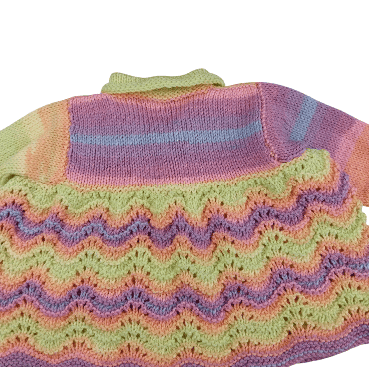 Looking for the perfect cardigan to keep your little one cosy and stylish? This hand-knitted baby girl’s cardigan is exactly what you need! Made with a lovely blend of muted rainbow tones, it offers a fresh take on traditional baby pastels. Featuring the intricate old shale stitch pattern from Shetland, this cardigan adds a touch of timeless charm to your baby's wardrobe.