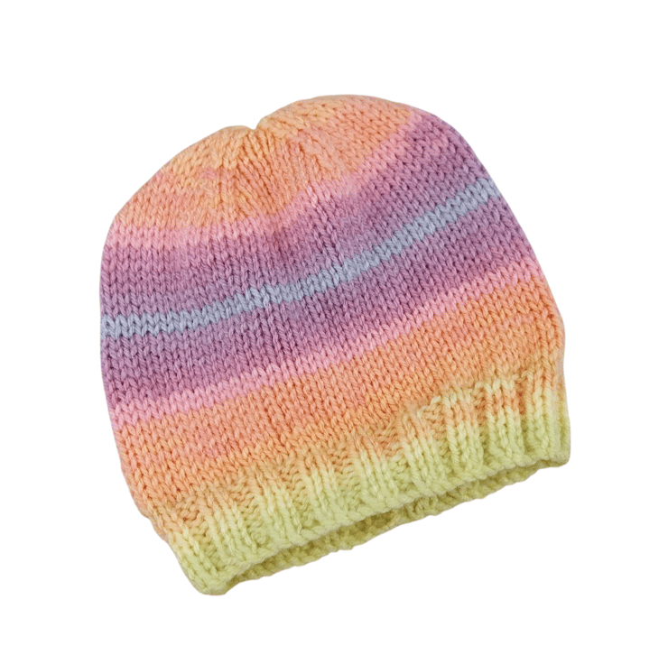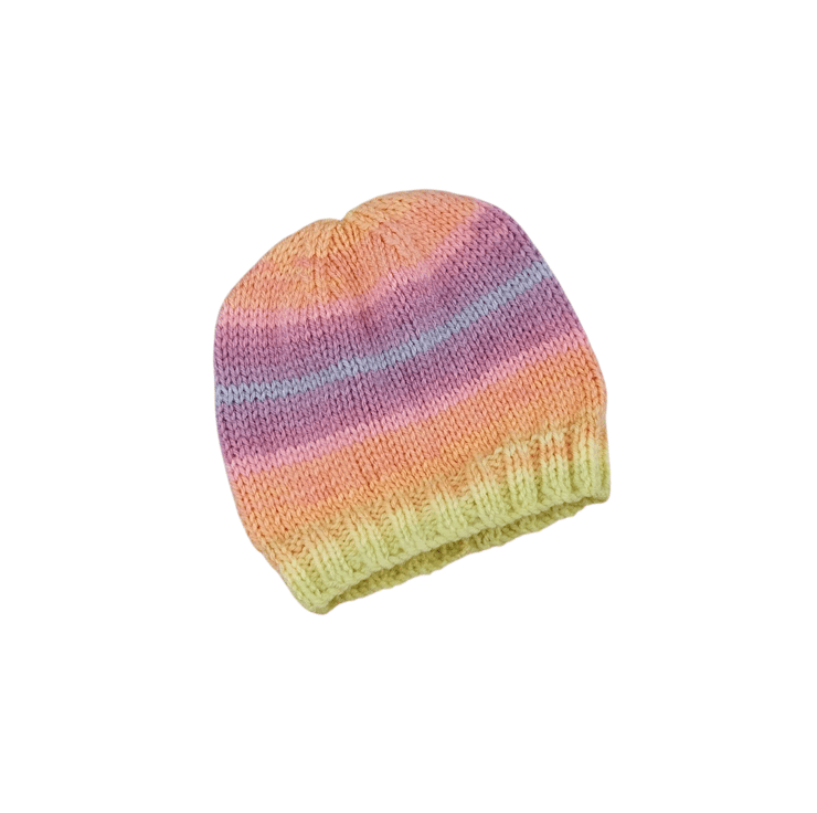 Add delightful pastels to your little one's wardrobe with this Hand-Knitted Baby Hat. Crafted with care from mesmerizing yarn, it features delicate rainbow stripes in soothing shades of purple, green, yellow, peach, and pink, exuding warmth and sophistication.