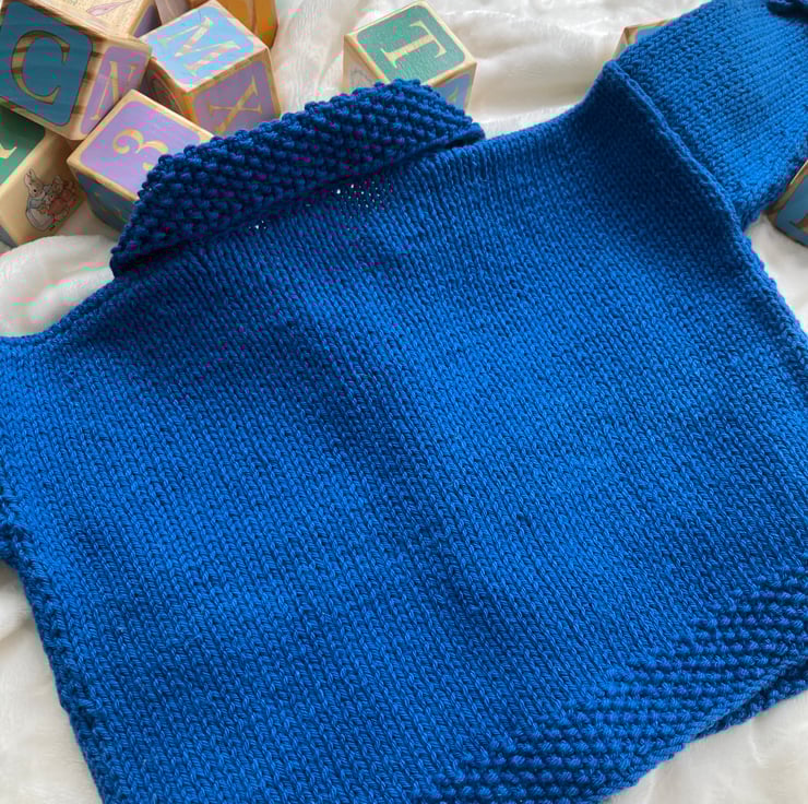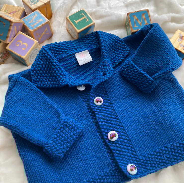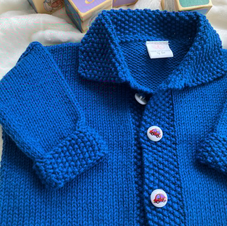 I have knitted this cute little cardigan using a royal blue pure cotton yarn - making it warm and breathable for your little one on those cooler days. The collar and edgings have been knitted in a seed stitch which adds texture and makes a contrasting feature. Acrylic car motif buttons add a colourful touch to the front fastenings.