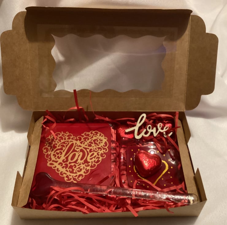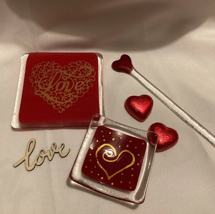 Something a little different as a valentines gift! But why wait until February? If you love someone, show them with this unique gift set. I have put together a gift box containing 1x 4” Love coaster, 1 x 3” trinket dish, 1 x 6” long fused glass drink stirrer. All the glass items have been made by myself in my garden studio. The trinket dish and coaster have been lovingly hand painted and have small silicone feet attached to keep them steady and protect furniture. The coaster also has a hand cut gold heart decal on it with the word “Love”. There are also 2 x heart shaped chocolates and a wooden “ love” ornament these will be sent in their own box that has been sealed with a heart sticker and a gorgeous red bow.