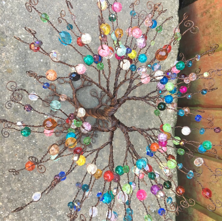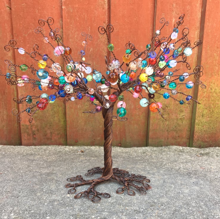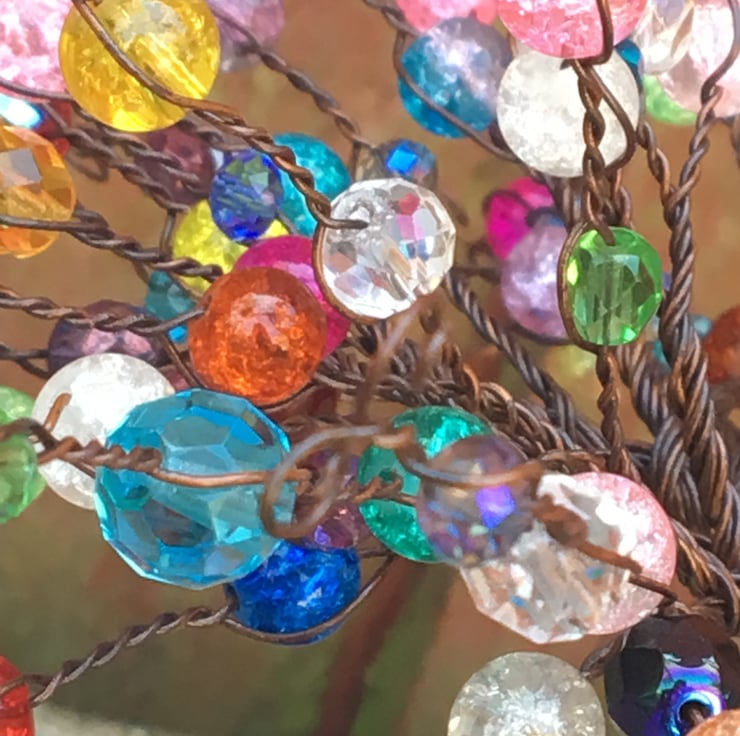 This stunning wirework tree is crafted from gunmetal wire and adorned with a vibrant array of crystals in various colors and sizes. Standing approximately 18cm tall, each tree is made to order. Please allow 10 days for creation and shipping. International orders may require additional delivery time.