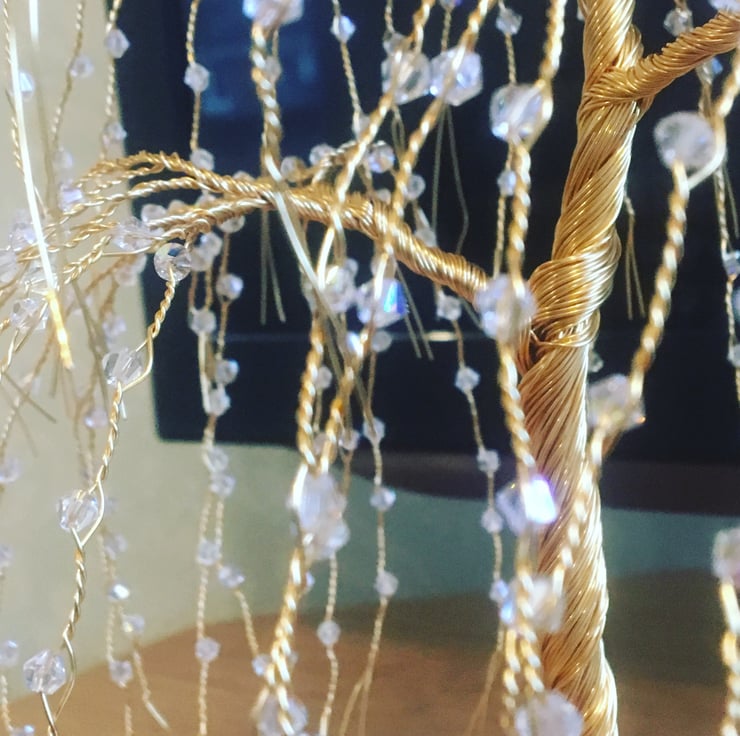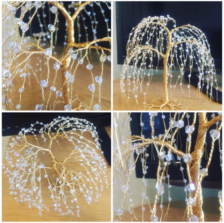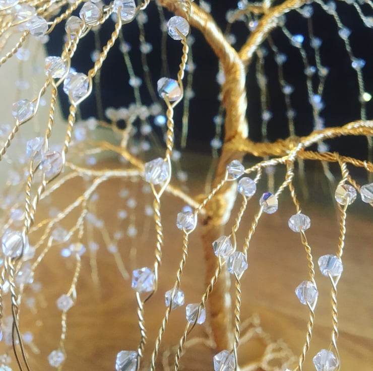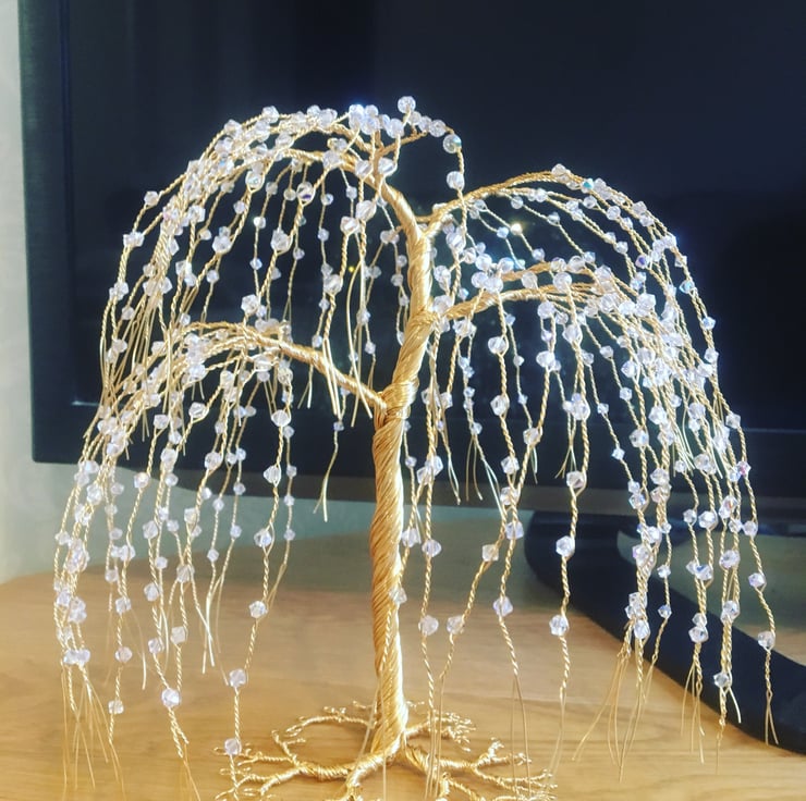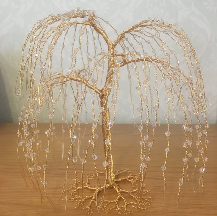 These willow tree sculptures are made with gold-colored wire and hundreds of clear crystals. They stand about 18cm tall. If you want different colors or types of crystals, please contact me to discuss. Each tree is made to order, so please allow 10 days for us to make and ship it. International orders might take longer to arrive.