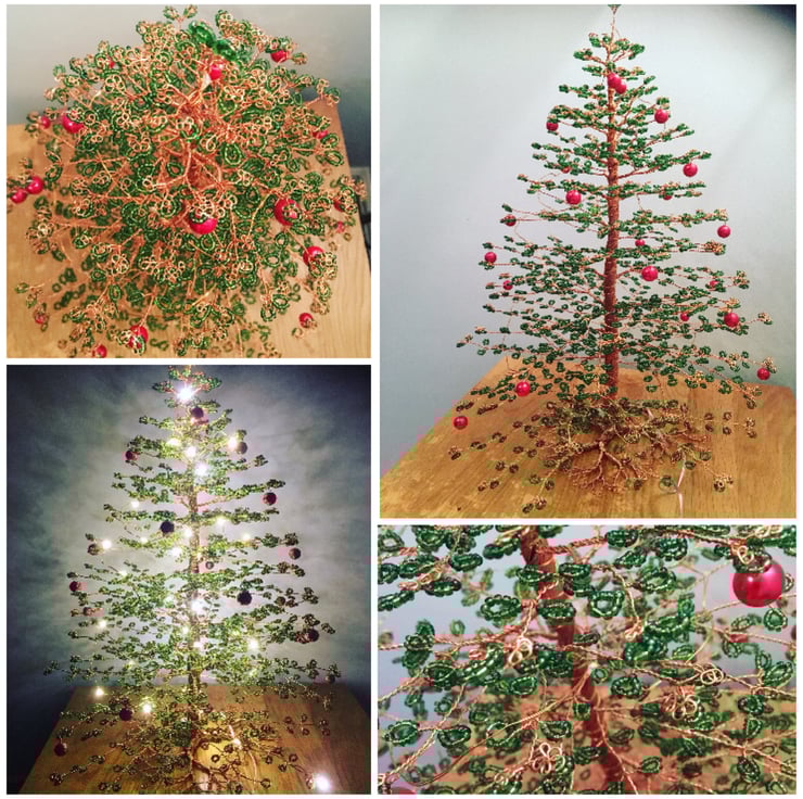 This beautiful light-up wire Christmas tree is made with copper wire, green seed beads, and glass beads to represent Christmas baubles. A unique addition to your Christmas set-up, the lights produce a nice, cosy, and festive look to any room.