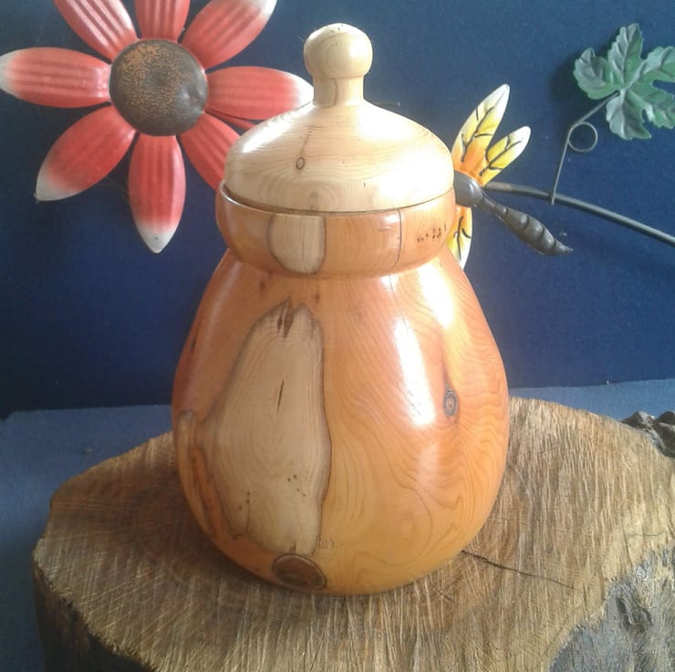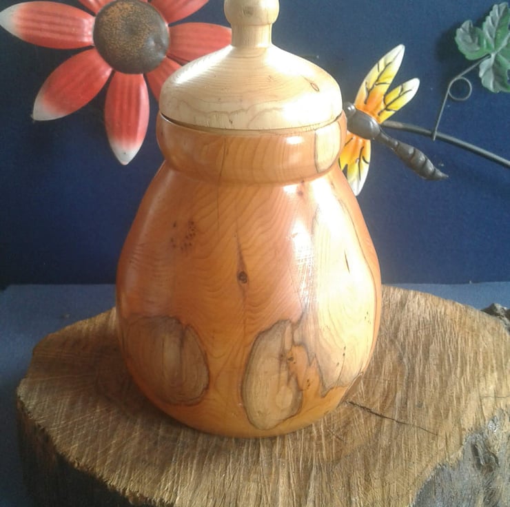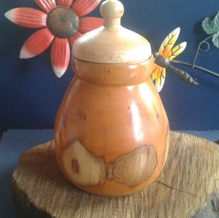 Honey pot shaped small storage pot. Hand turned from two different woods.