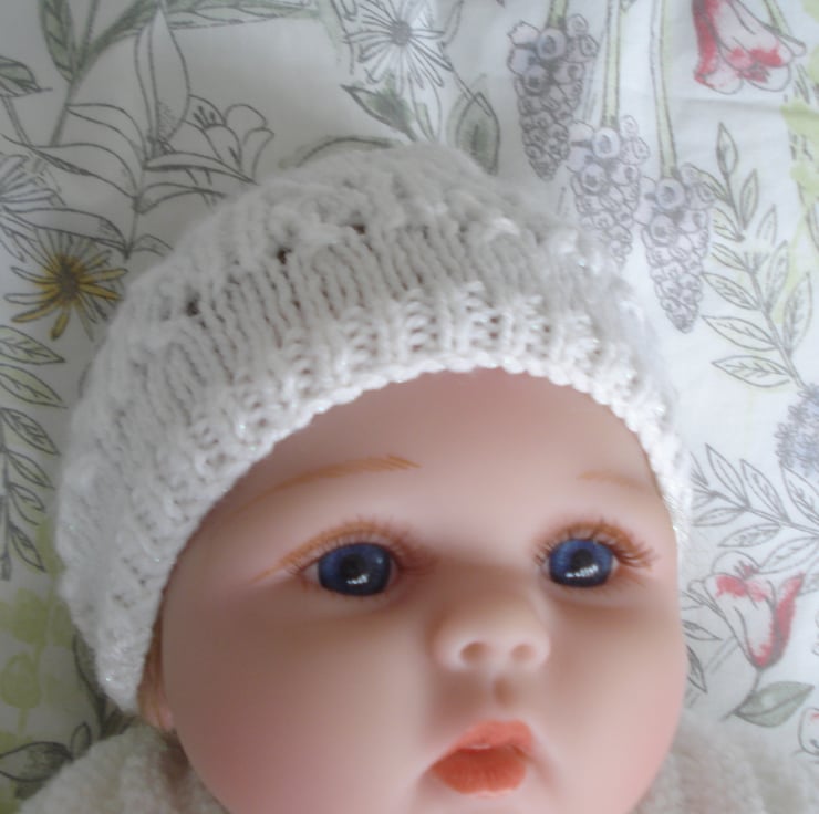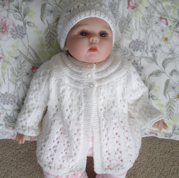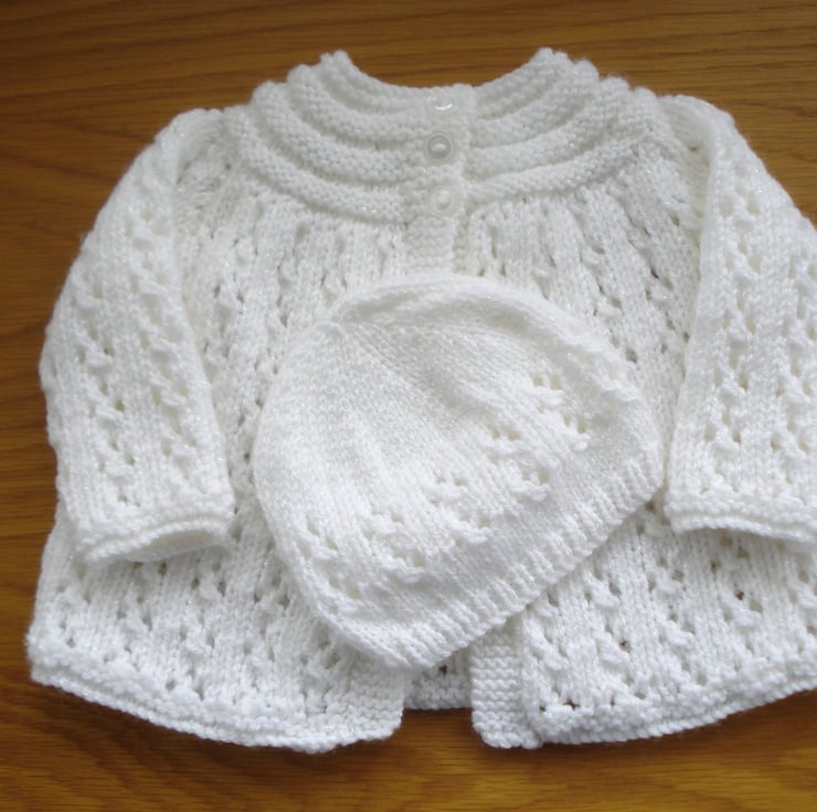 This is a pure white set of a jacket and hat knitted with an acrylic sparkle yarn. There are three plastic buttons at the top of the front yolk.