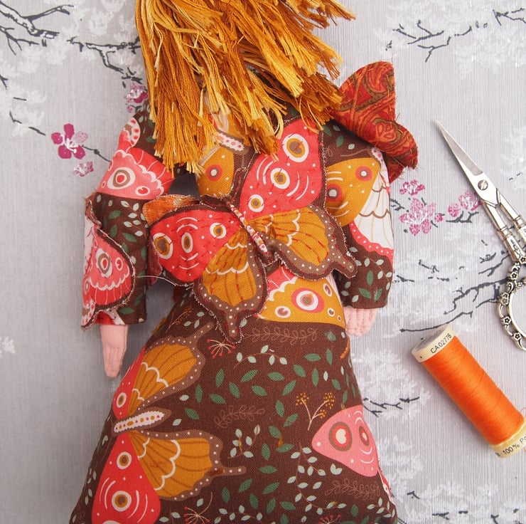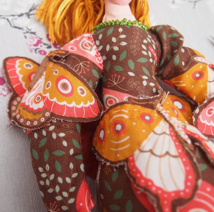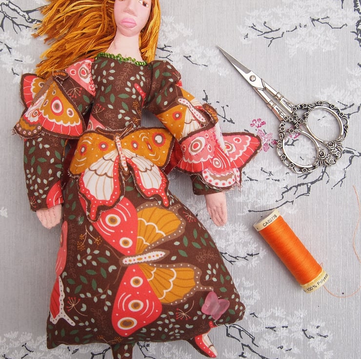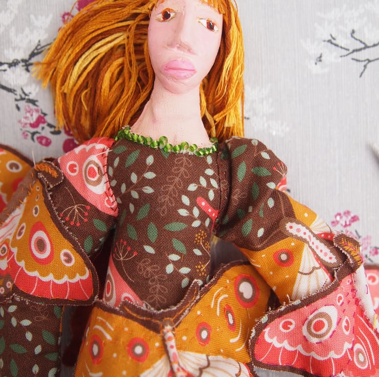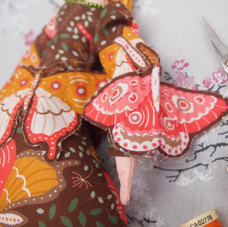 This art doll was inspired by the fabric. I realised I could cut out the butterflies and add them as an extra layer of detail to the main body. I think of her as a guardian spirit protecting nature and the beautiful butterflies and moths of our gardens.