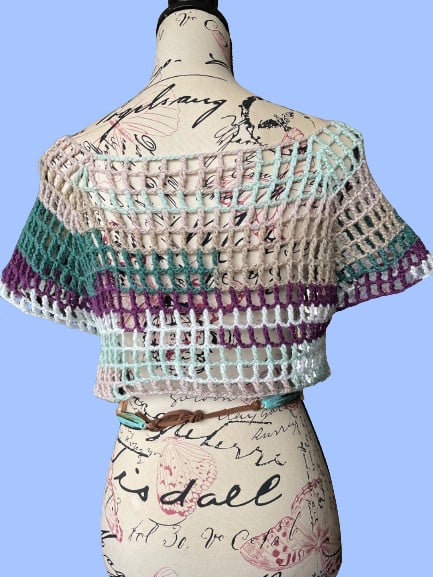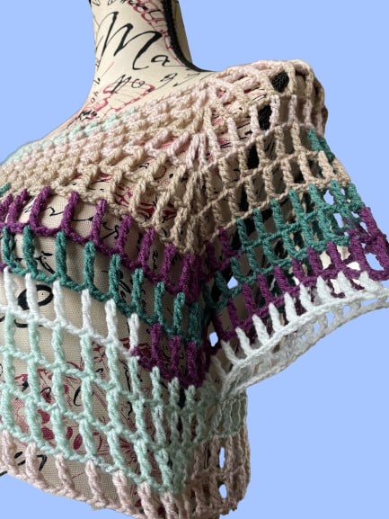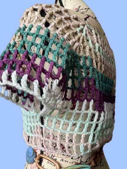 A lovely light colourful mesh top, crochet in Funfair Helter Skelter Yarn from Emu.