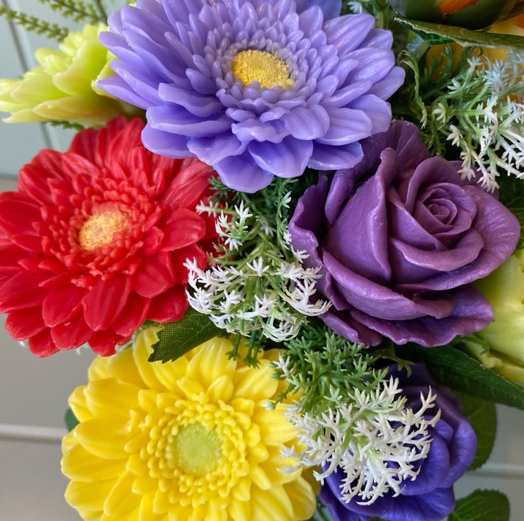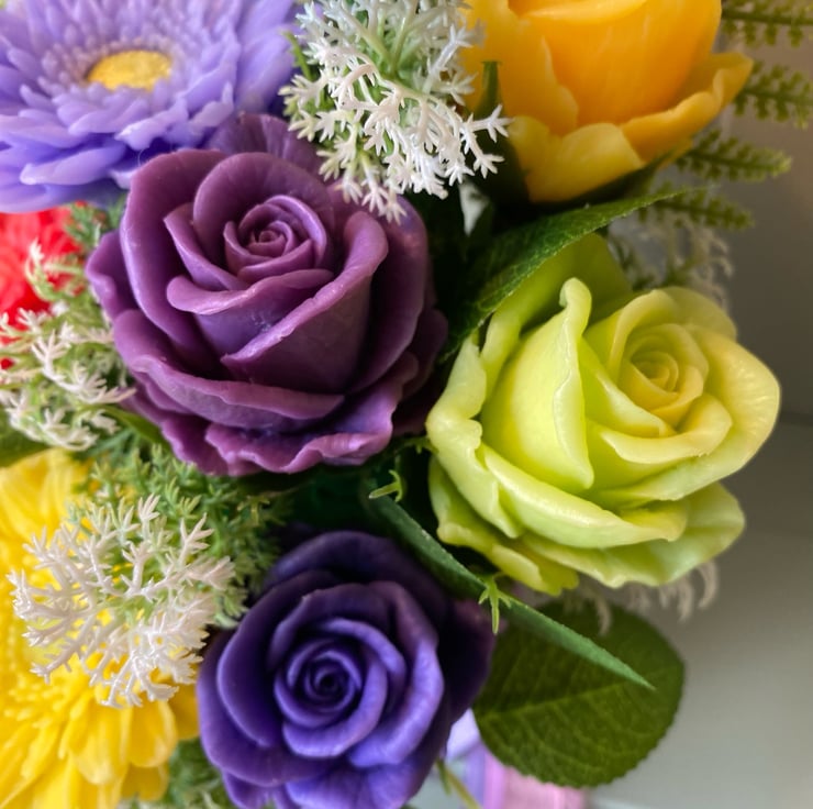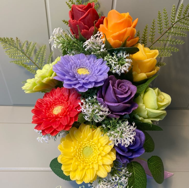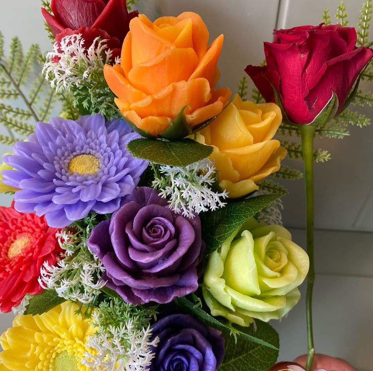Discover the allure of our Soap Flower Bouquet, a masterfully crafted collection of vibrant, handmade vegan soap flowers. This stunning bouquet showcases a variety of colourful flowers, including Roses and Gerberas, each artfully designed to resemble their natural counterparts.