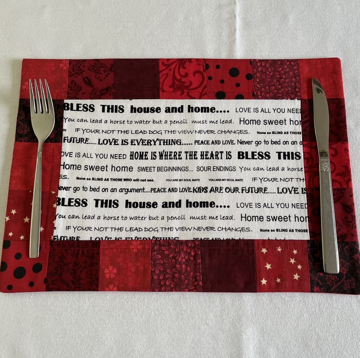 Set of four fabric place mats. Measuring approx 35cm x 25cm. Made from 100% cotton and heat resistant wadding. The centre fabric features sentiments such as 'Home Sweet Home'. The border is made up of red 2" square patchwork and finished with red topstitching. The reverse is plain red cotton fabric.