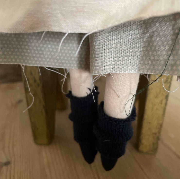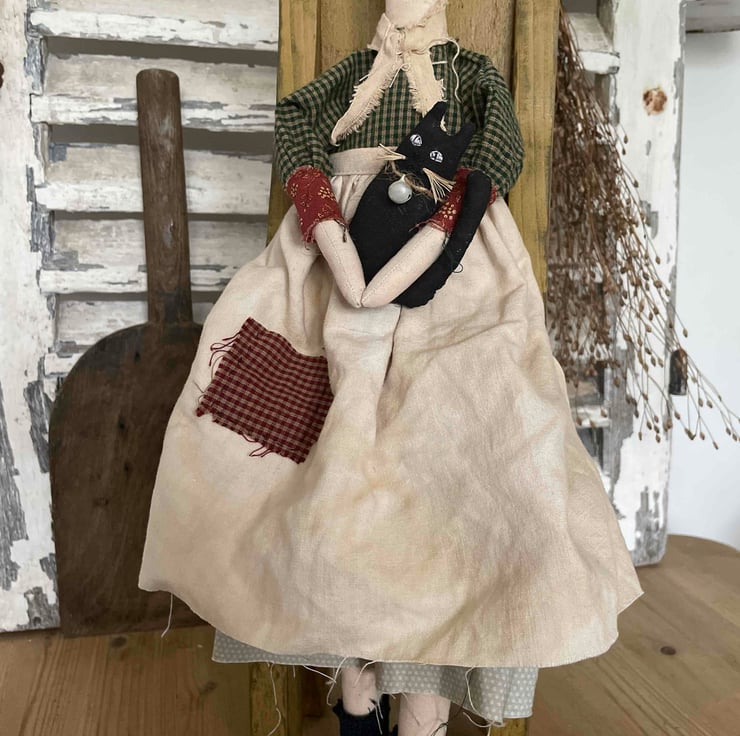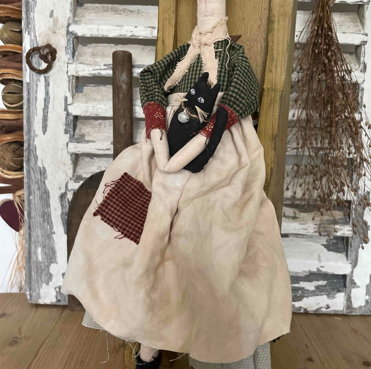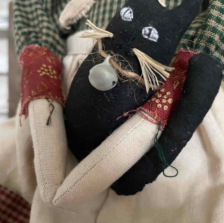 A charming Raggedy Mary rag doll handmade from recycled, repurposed and homespun fabrics…she wears a green homespun check dress, an apron, bloomers and leg warmers and carries her cat. She measures 46cm (18”) tall