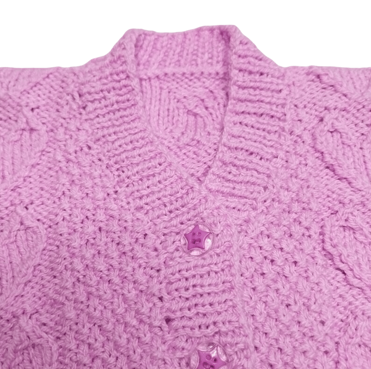 Experience warmth and elegance with this V-neck cardigan featuring three clear buttons, each with a captivating mauve star center.