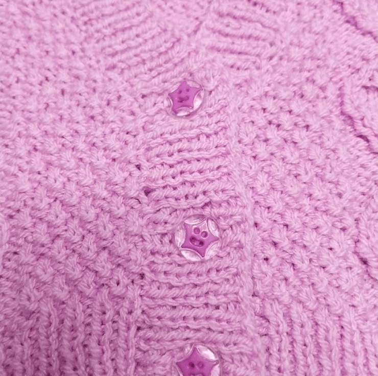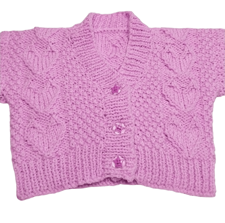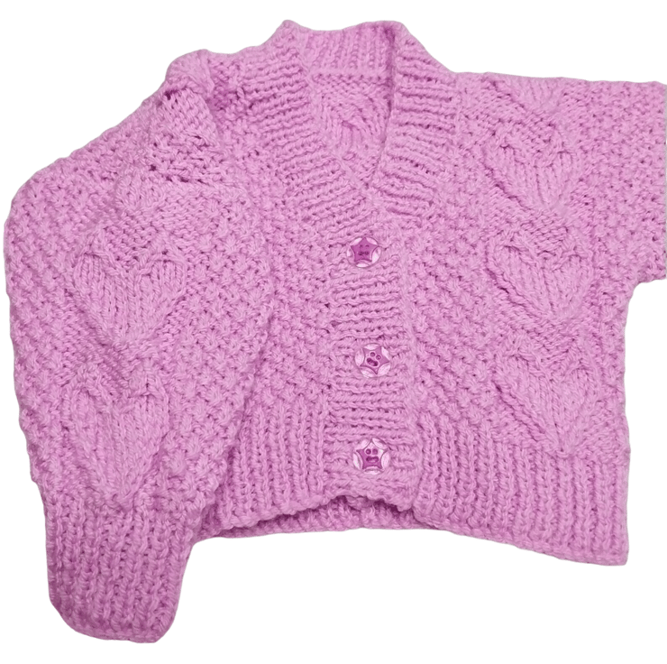 Hand-knitted baby cardigan in the enchanting shade of Clematis pink, perfect for wrapping your little one in warmth and style.