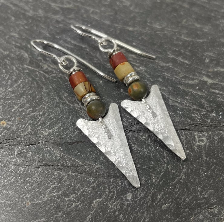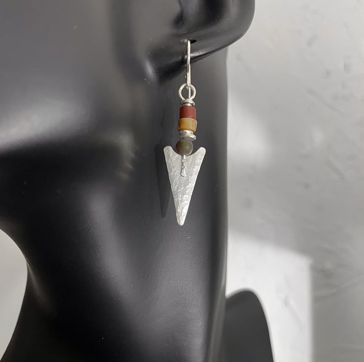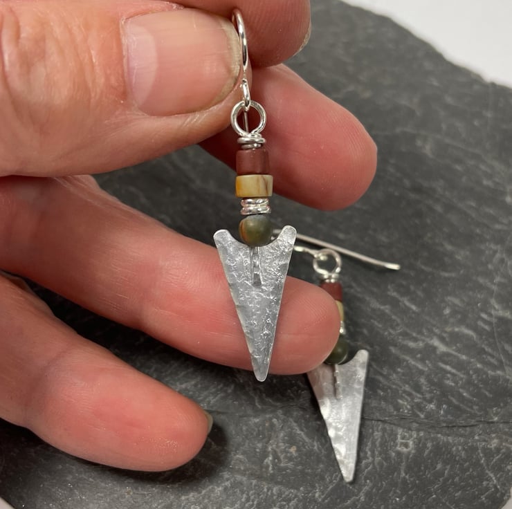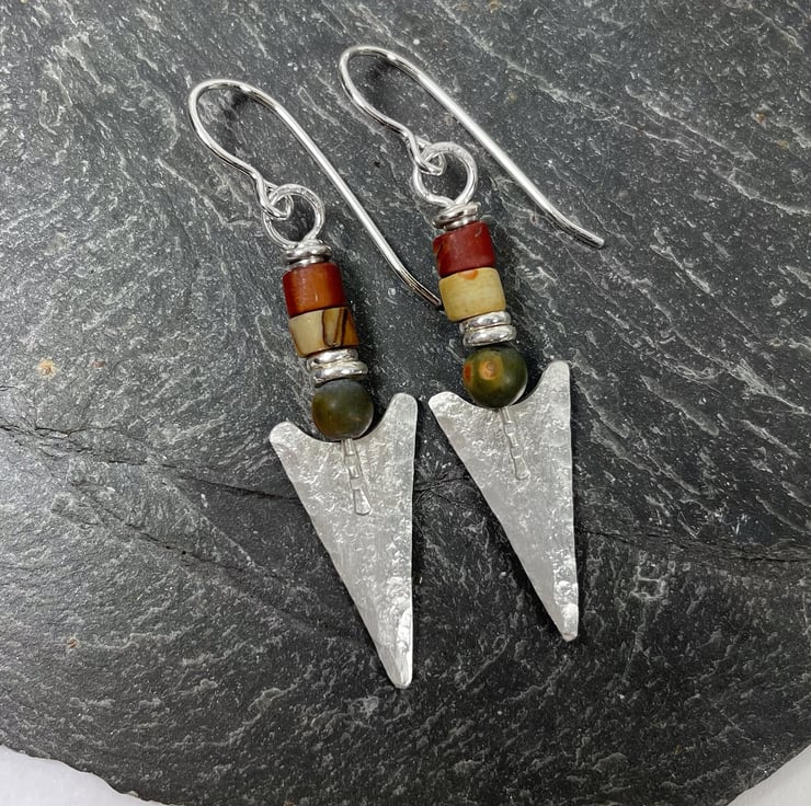 Sterling silver triangular drops have been combined with earth toned jasper beads .