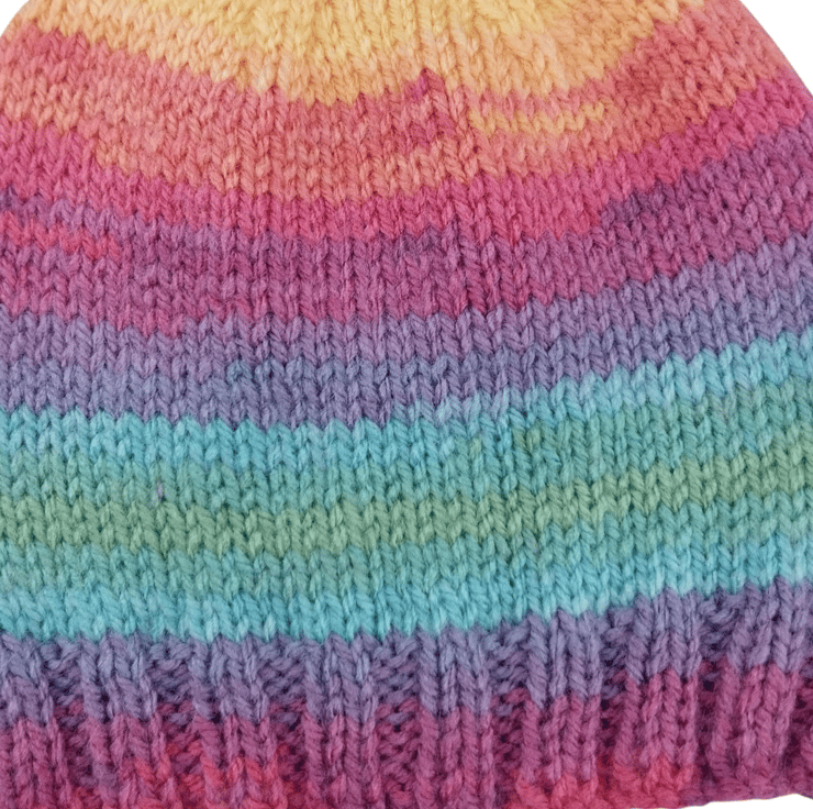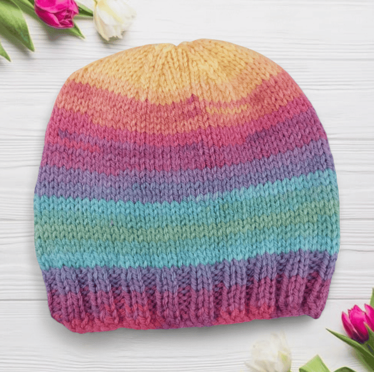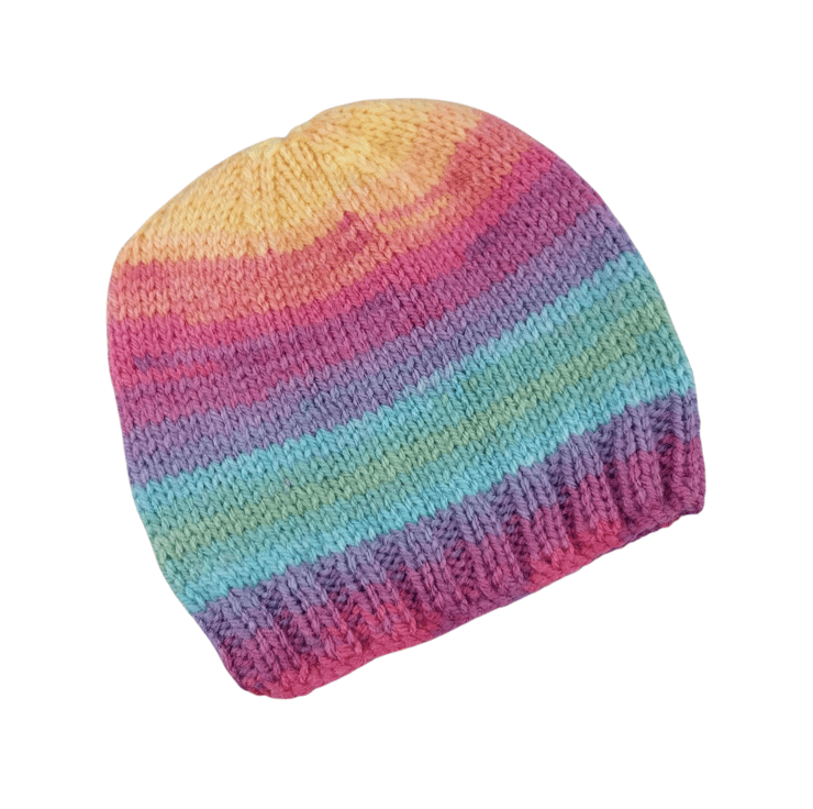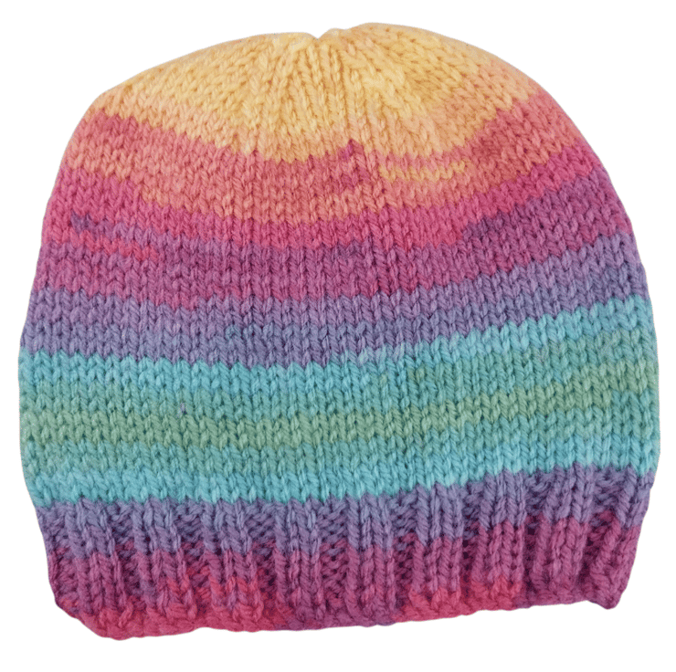 Elevate your baby's style with these hand-knitted baby hats, showcasing a captivating palette of self-striping shades in muted rainbow tones. From sunny yellow to tranquil blue, each hat provides a refreshing alternative to the typical pastels found in baby clothing.