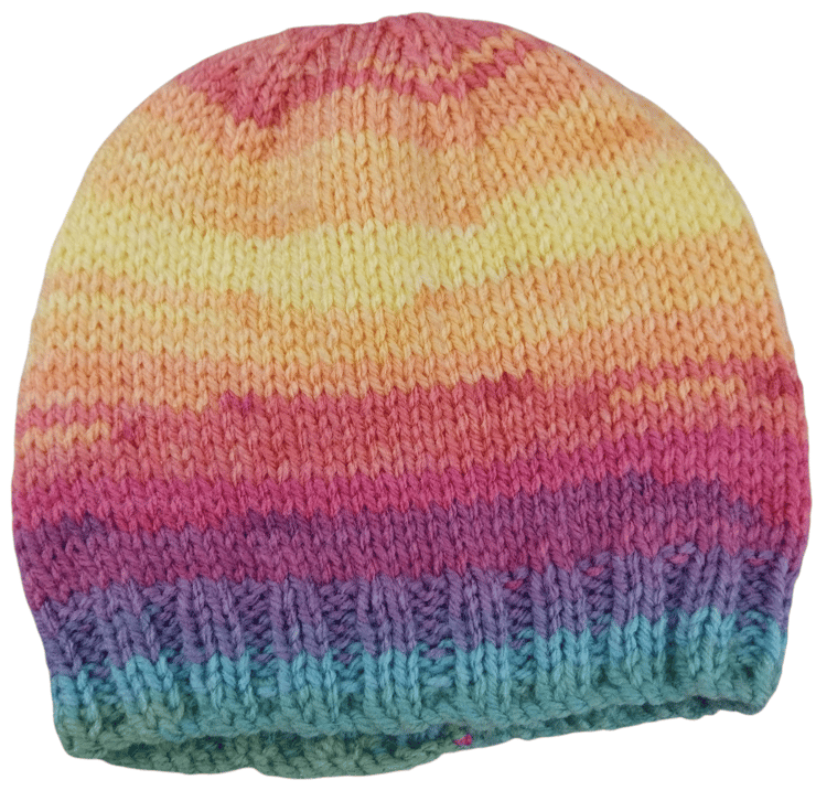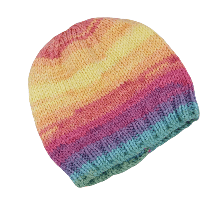 Elevate your baby's style with these hand-knitted baby hats, showcasing a captivating palette of self-striping shades in muted rainbow tones. From sunny yellow to tranquil blue, each hat provides a refreshing alternative to the typical pastels found in baby clothing.