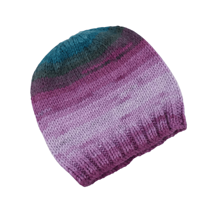 Wrap your little one in warmth and style with this hand-knitted baby hat in charming shades of purple and blue.