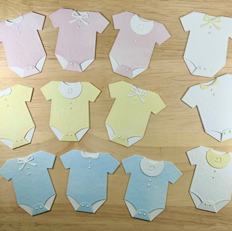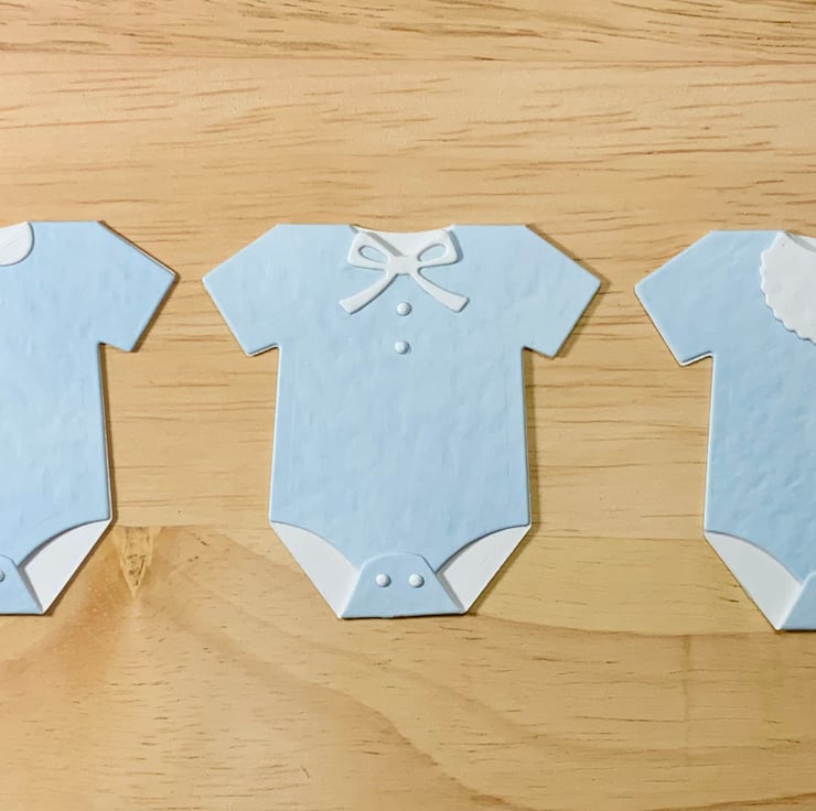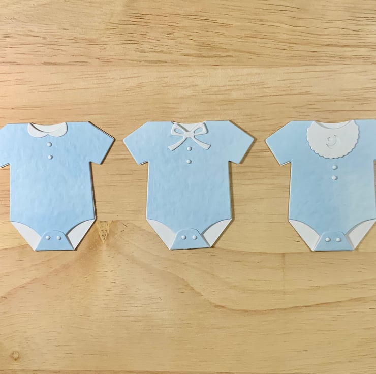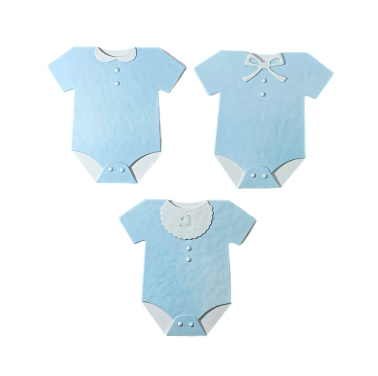 A set of 3 baby vests each with a different neckline detail - bow, collar or bib. They are cut from 300gsm hammered card and would look great on a new baby card or a baby shower invitation.