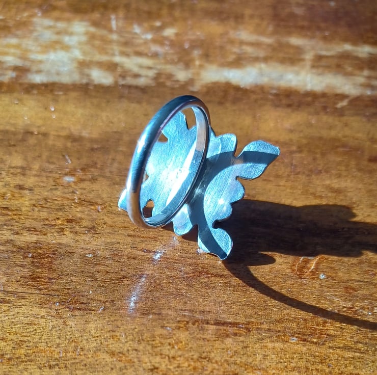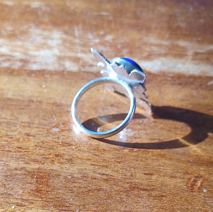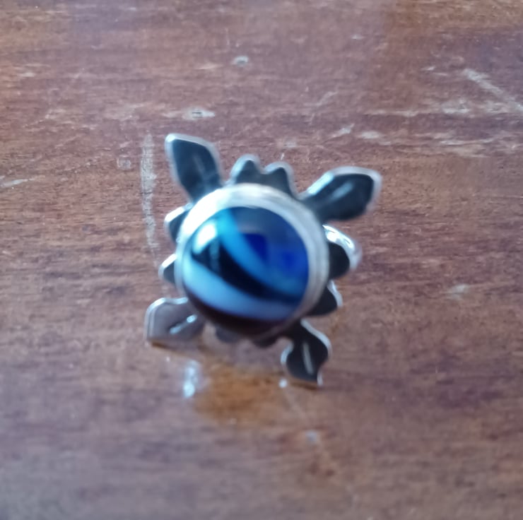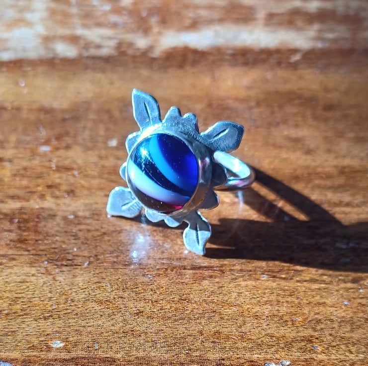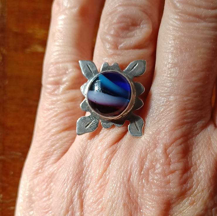 An unusual sterling silver ring with a square flower motif that has a blue striped glass cabochon at its centre. The flower is 2cm square. The cabochon is 1.2cm diameter. The ring is UK size O.