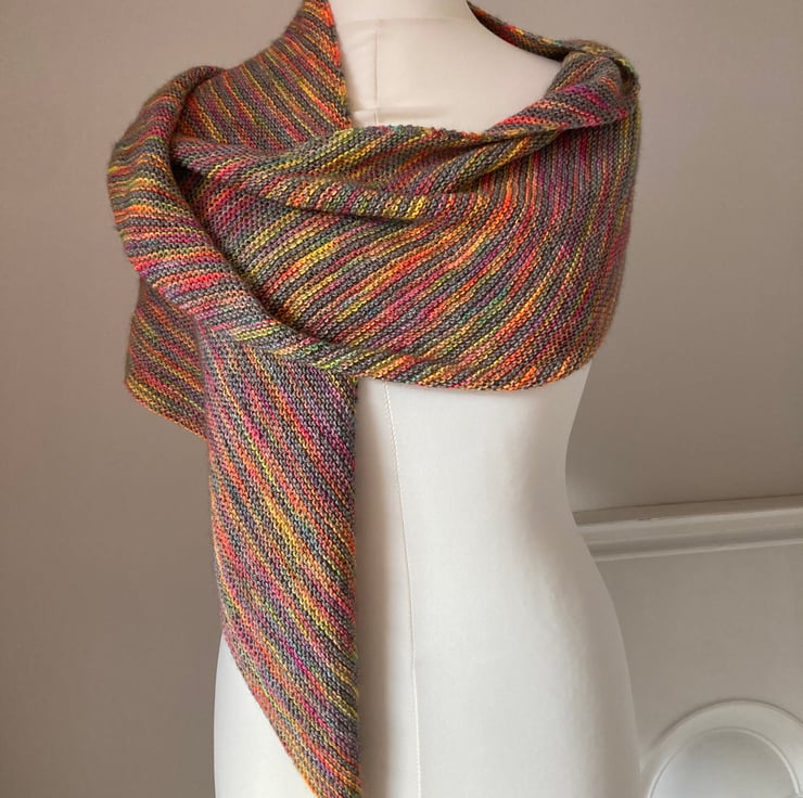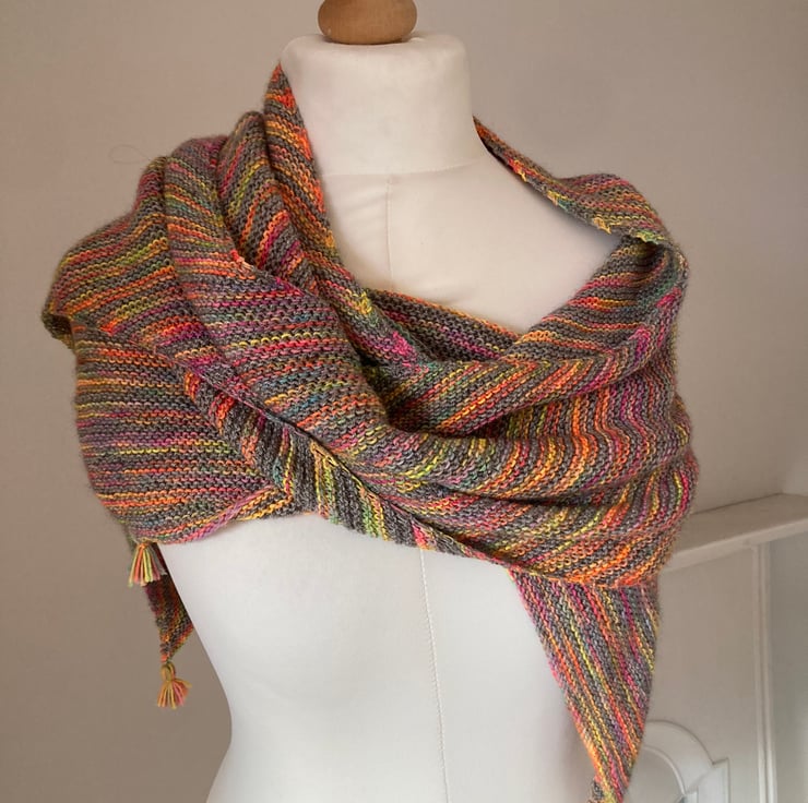 Luxury hand knitted wrap in neon rainbow and grey striped merino wool. The wrap is a versatile parallelogram shape meaning that it can be worn in several different ways. There is a little tassel on each corner.