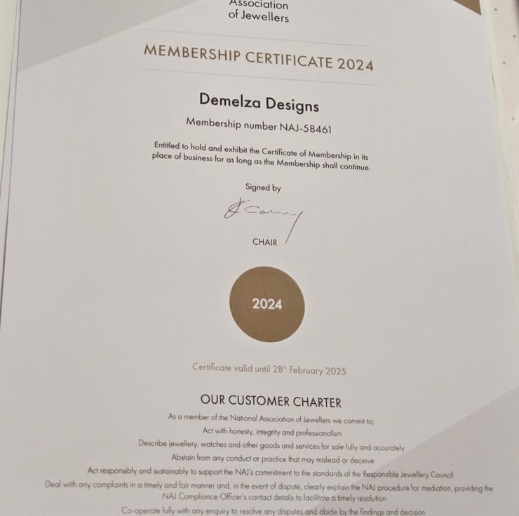 Demelza Designs has been approved by the largest prestigious 'National Association of Jewellers' (NAJ) having met their vigerouse vetting processes as British Jewellery Designer/Craft Person. All registered members must abide by their professional customer charter including asking a fare price for their products.