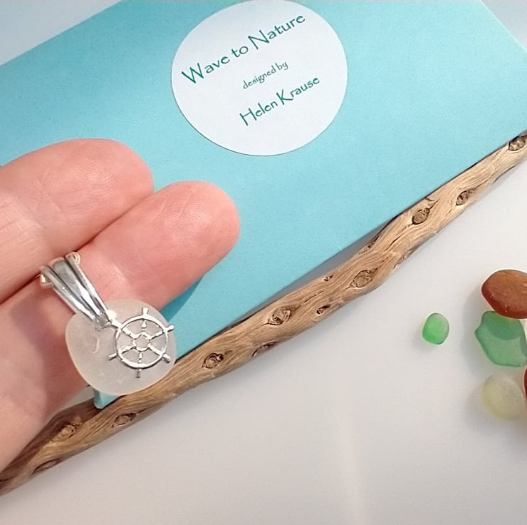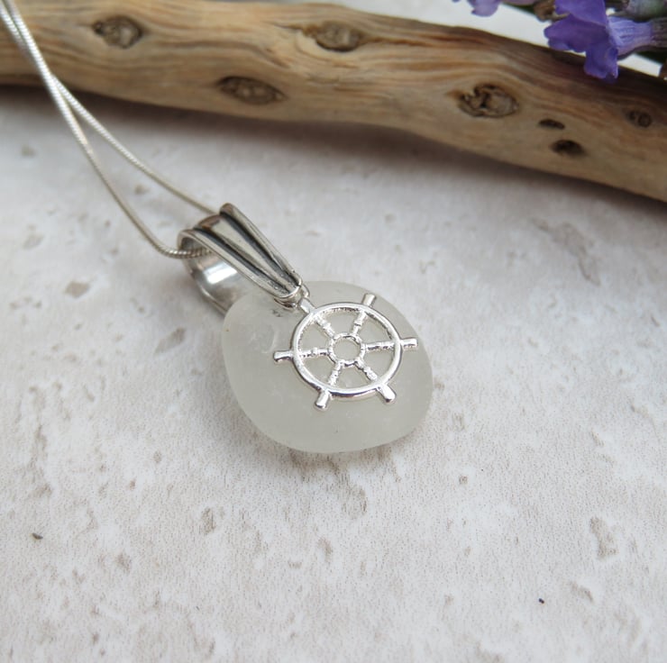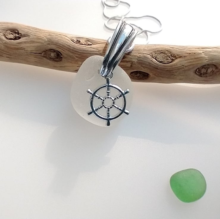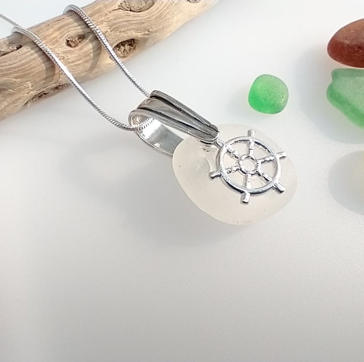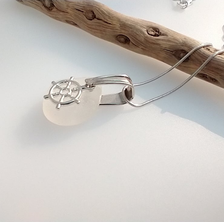 This natural frosty white sea glass is coupled with a dainty Sterling silver ship wheel charm on a Sterling silver bail suspended on a Sterling silver snake chain. The sea glass has been hand selected from the beach at Seaham and washed in soapy warm water afterwards. No other treatment has been given to this pretty nautical necklace. Each piece of sea glass is different and no two pieces are the same as they all have different shapes and textures due to the random tumbling they are exposed to by the waves of the sea.
