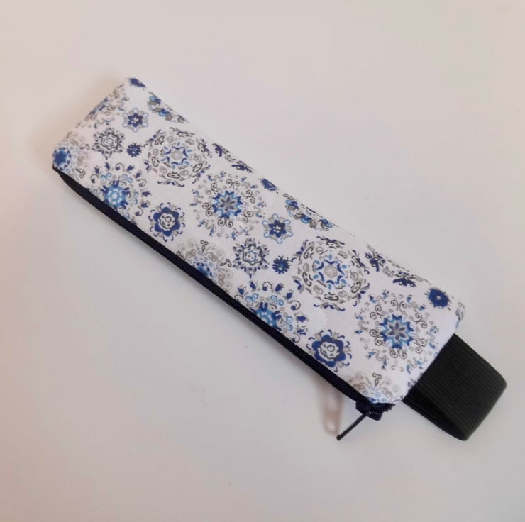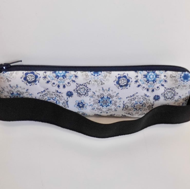 This one is made using a beautiful blue and white quilting cotton. I backed this fabric with felt and then machine stitched down each side with three rows of wave stitch to achieve a lightly quilted effect. The cotton lining is a coordinating blue with small white spots.