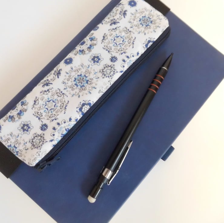 It has a navy blue zip across the top. The elastic is black and 23mm wide. The pencil case measures about 17.5 cm x 5 cm and I have shown it here on the cover of a book 21cm tall and it fits perfectly, although because it's elastic it will fit a book perhaps a couple of centimetres bigger.