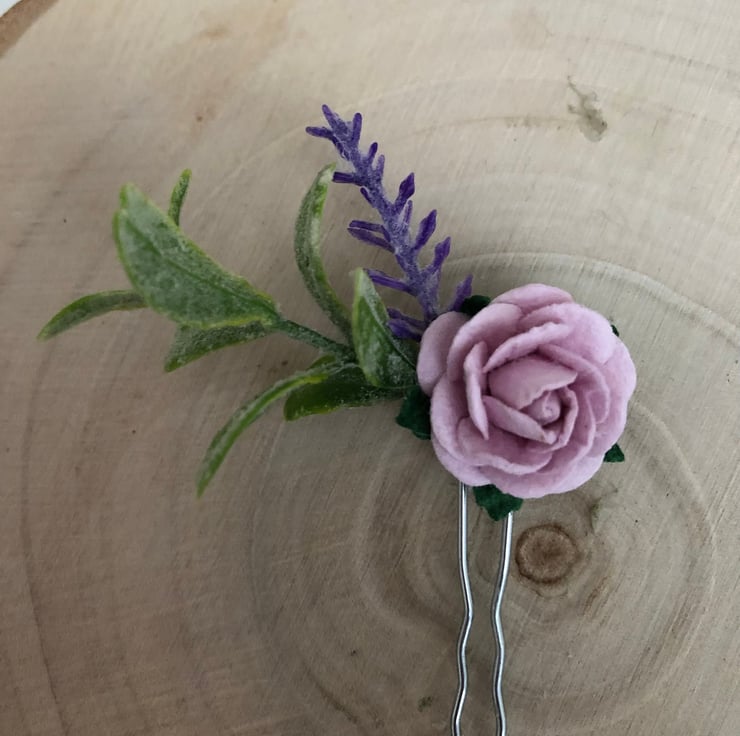 This is a set of 3 delicate flower hair pins. Featuring a lilac paper rose, a small sprig of lavender and a small piece of foliage.
