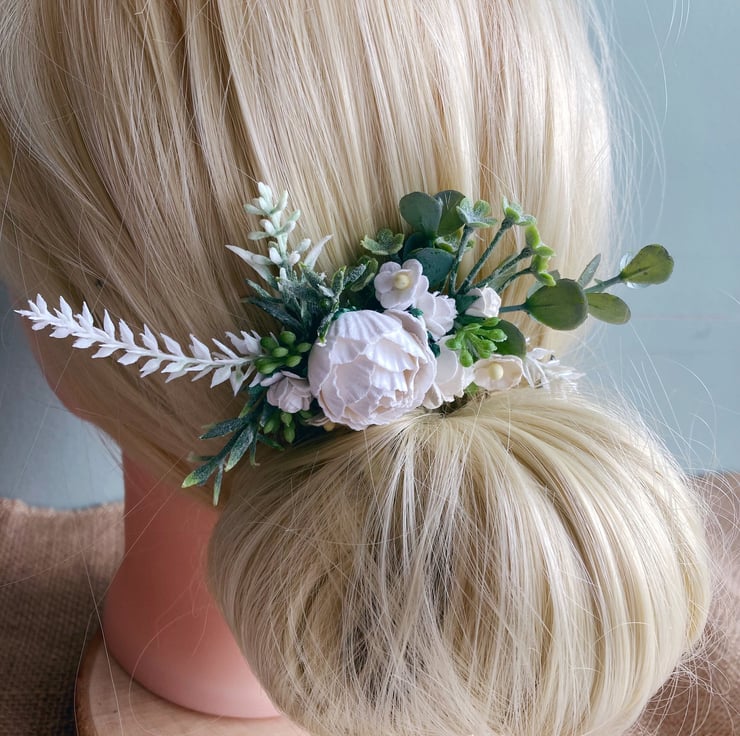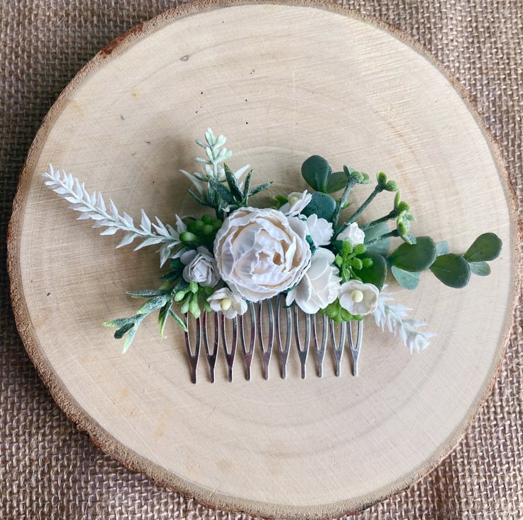 The hairpiece features white paper flowers, white lavender and faux foliage set on a silver comb.