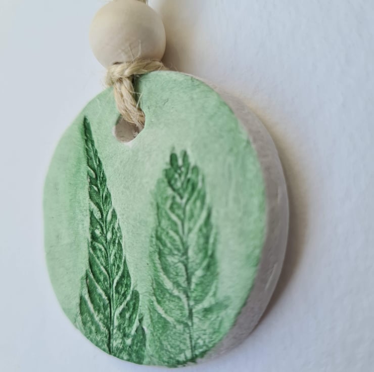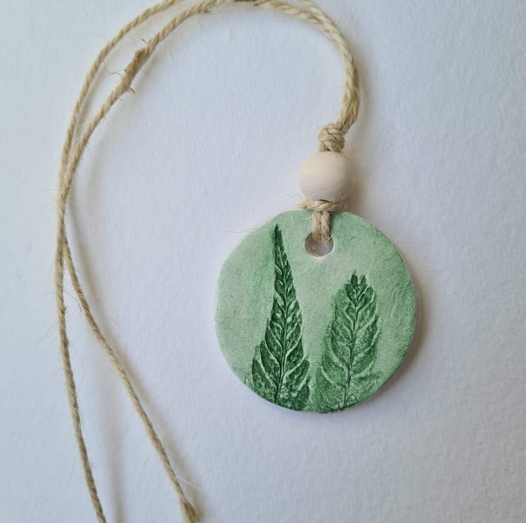 Pretty fern printed cards and a round gift tag made of air-drying clay to use for a gift or for home decor. The cards and gift tag have been imprinted with the same ferns so could be given together.