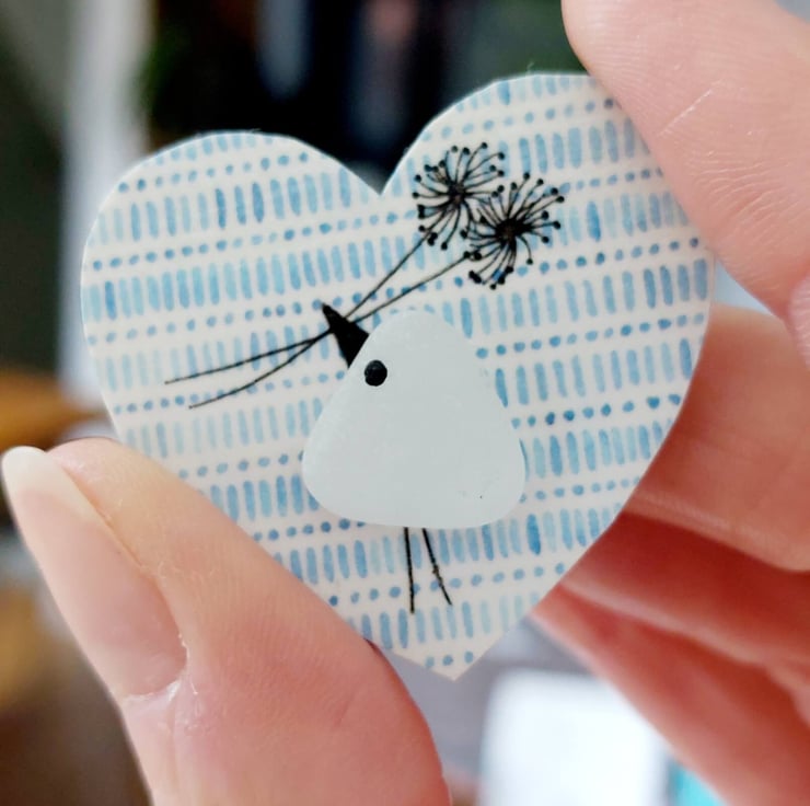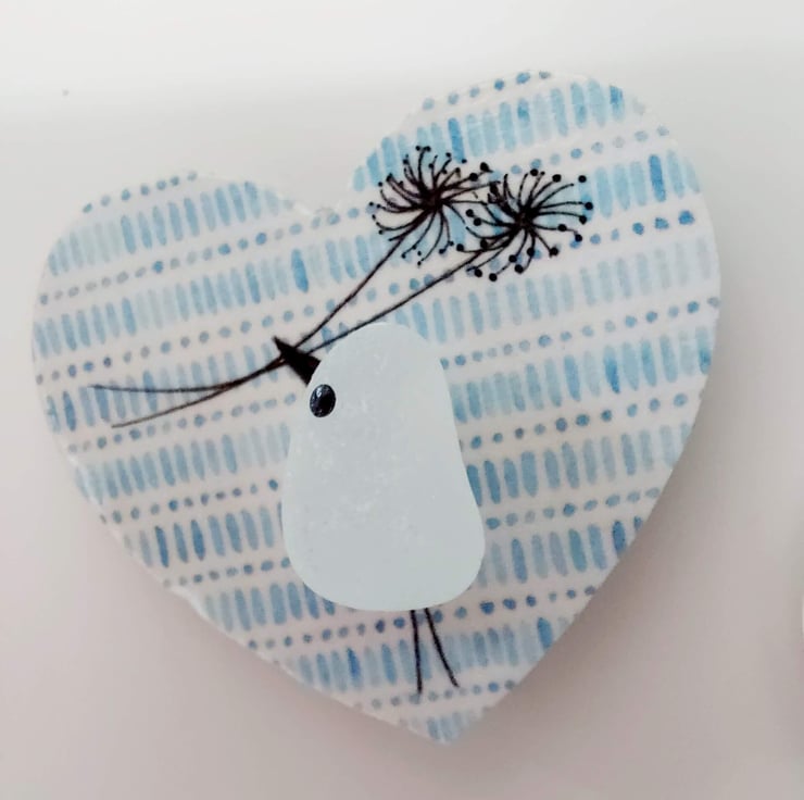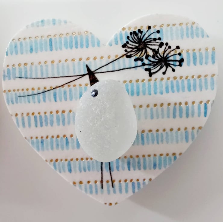 Your unique and individually crafted cute little bird has been made with a piece of perfectly tumbled and frosted clear sea glass from my collection, carefully selected for its shape, before being delicately placed onto a little wooden heart, covered in a blue coastal themed design. The extra little details on this design have been hand drawn with ink and and there is a magnet on the reverse so you can display it on any magnetic surface. Please check the product dimensions provided in the description below.