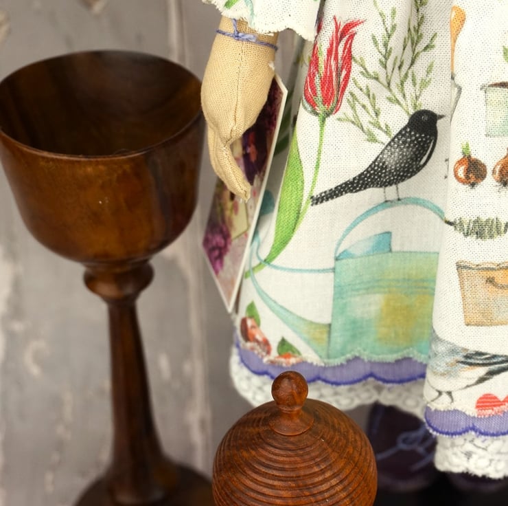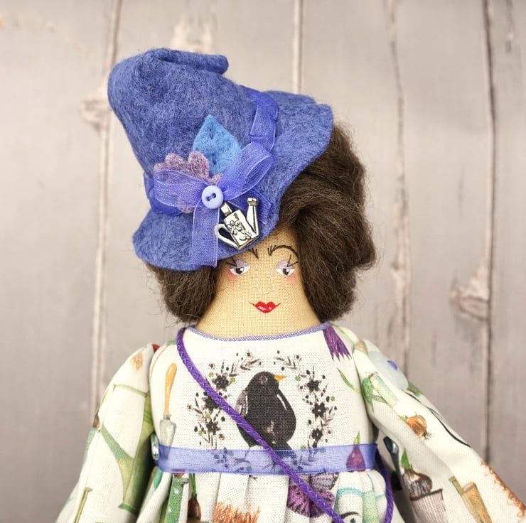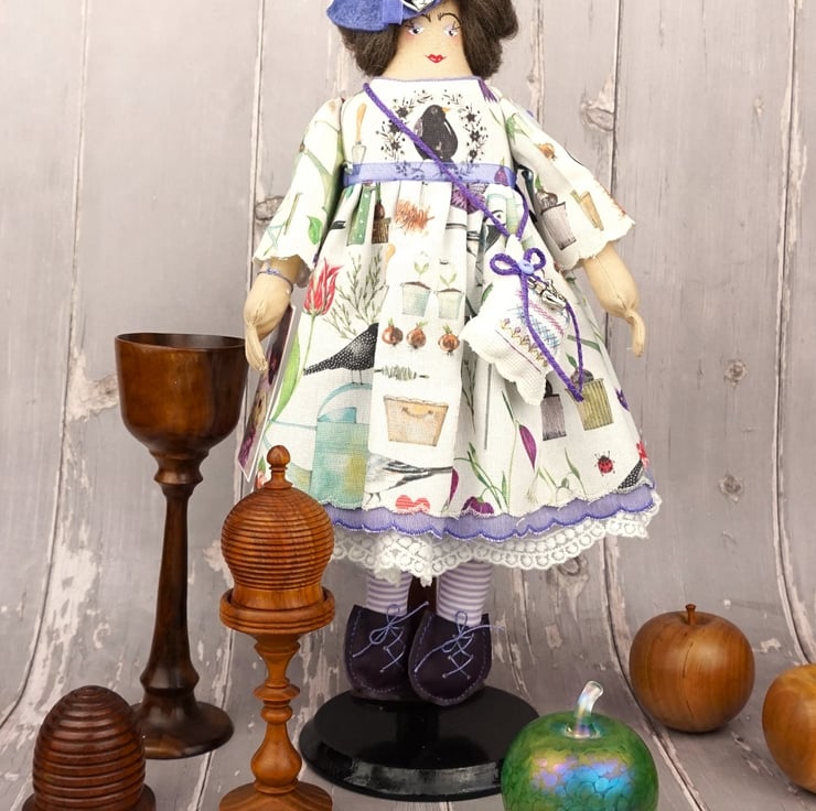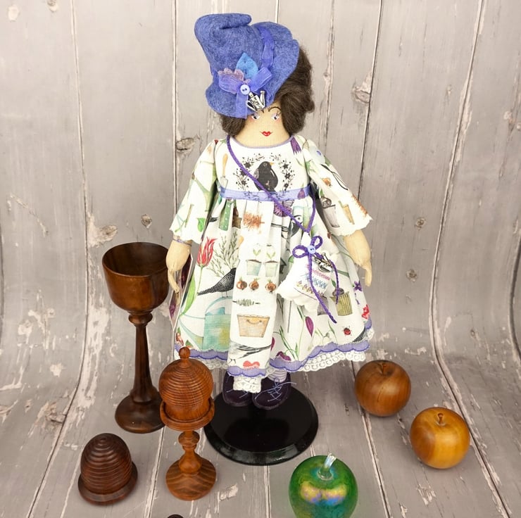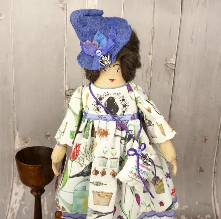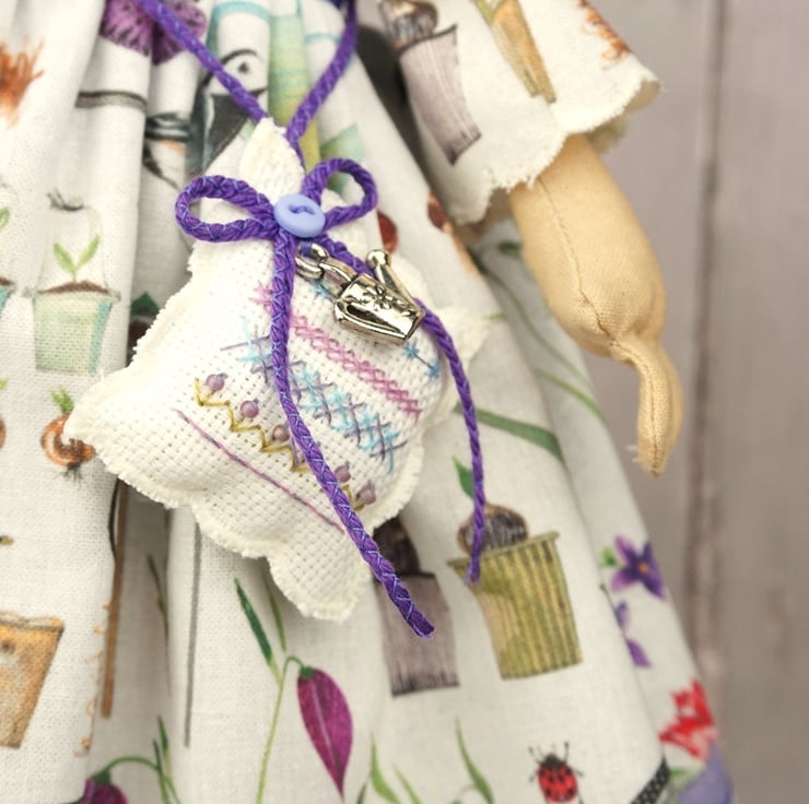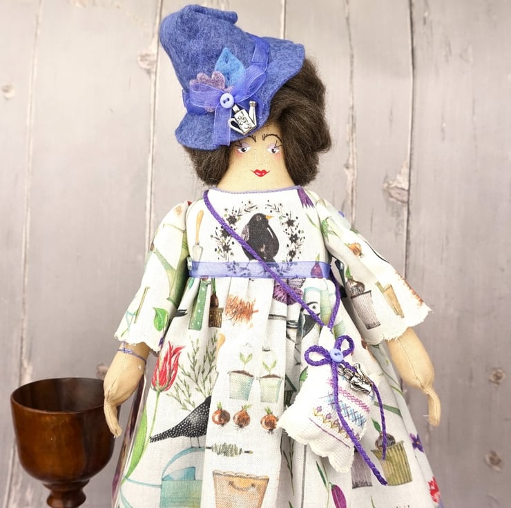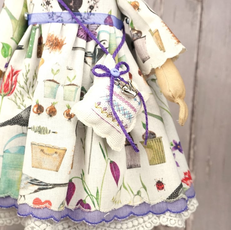She is dressed in an Acufactum print called Garden Poetry, a white ground with wild flowers bulbs, birds and garden tools abounding. Her outfit is completed with tiny buttons, leather shoes and a little sampler on her little sachet. She has co-ordinating knickers and underskirts in cotton and white tulle lace. She has a little silver watering can on her hat and another on her sampler.