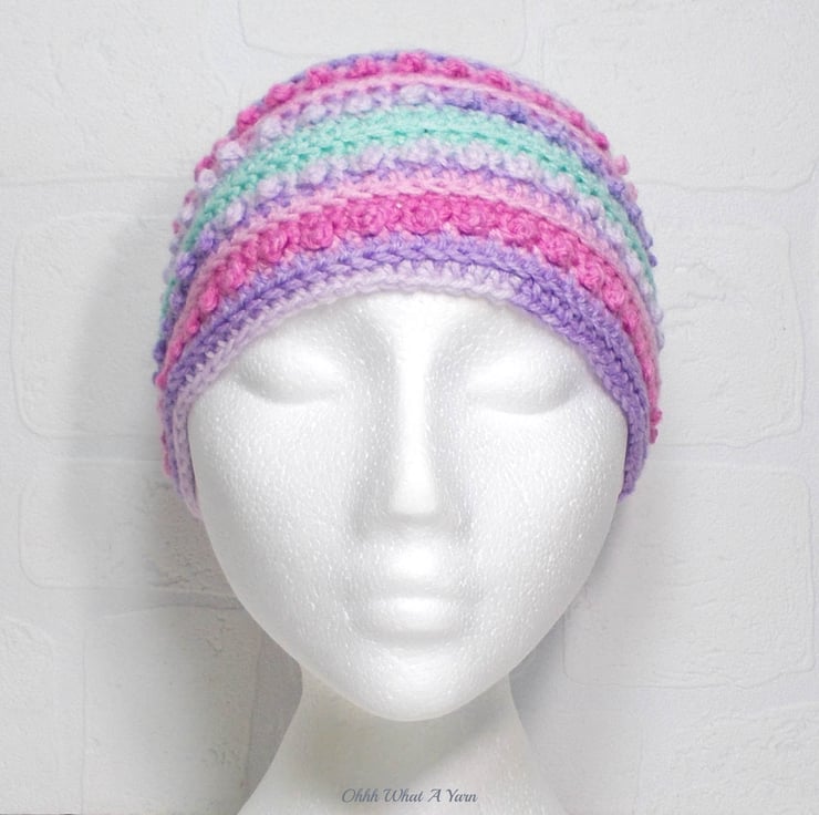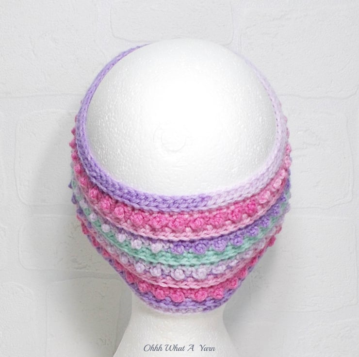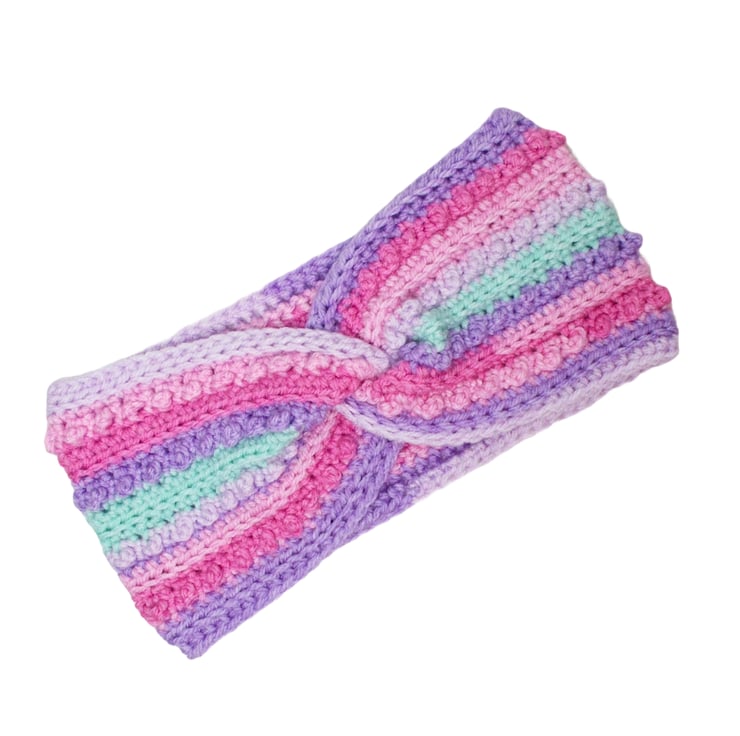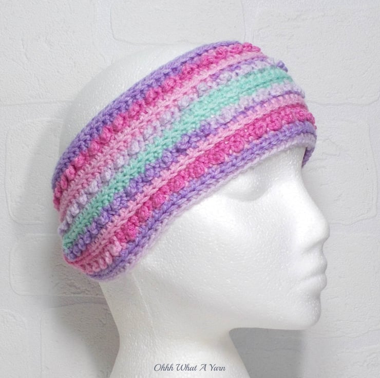 This gorgeous one size ladies ear warmer/headband has been crocheted using a gorgeous 100% premium acrylic yarn in gorgeous pastel shades of pink, lilac and green,