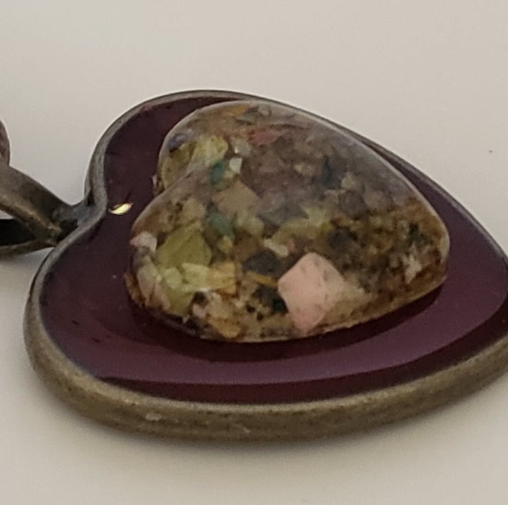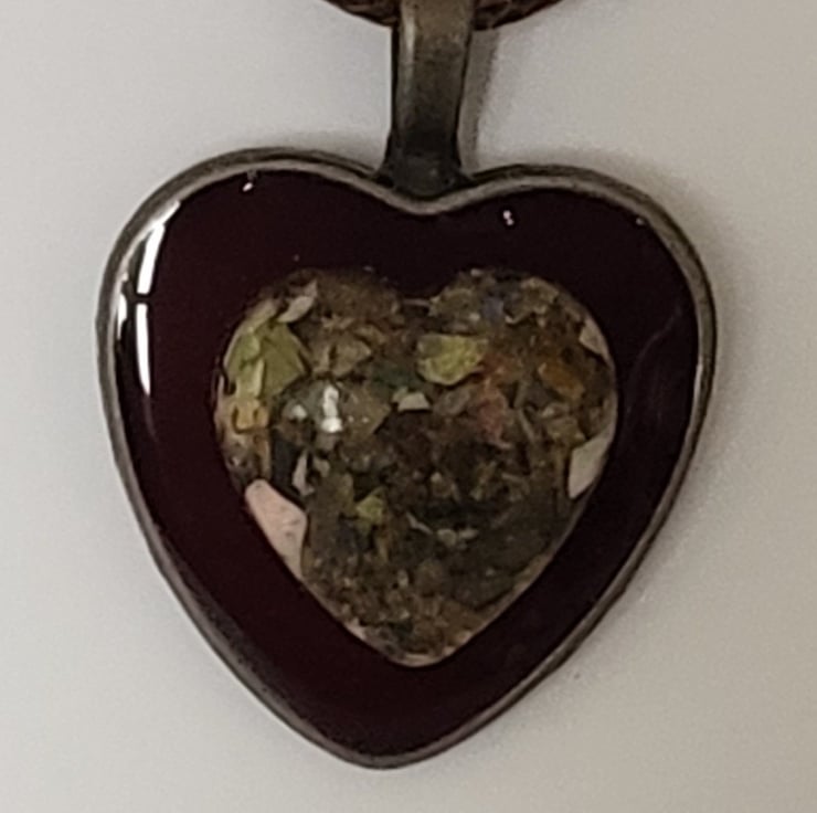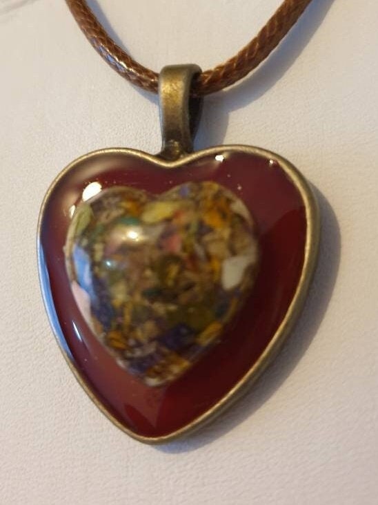 This is a lovely double heart pendant necklace made in resin. The large heart has a deep colour red resin set in a bronze coloured bezel. On top sits a smaller heart of dried flower confetti.This can easily mix with ashes or pet hair.