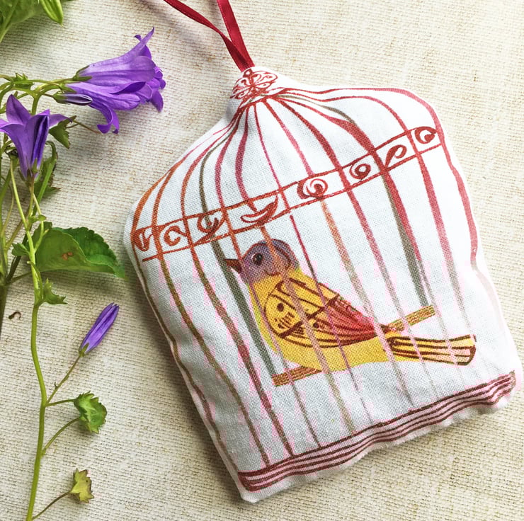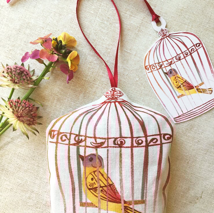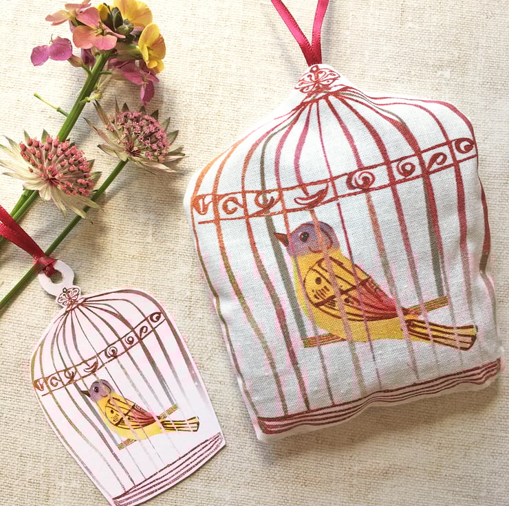 The design has been printed onto 156gsm cotton fabric with plain white on the reverse and finished off with ribbon loop.