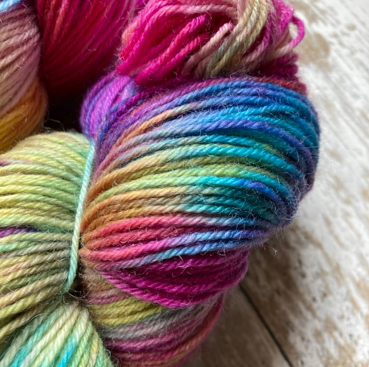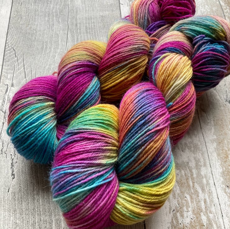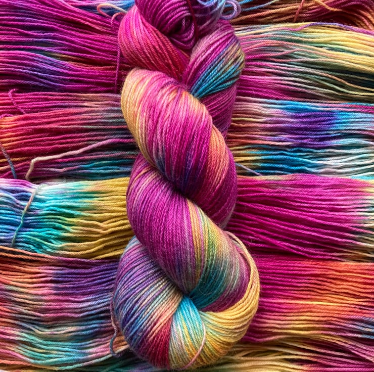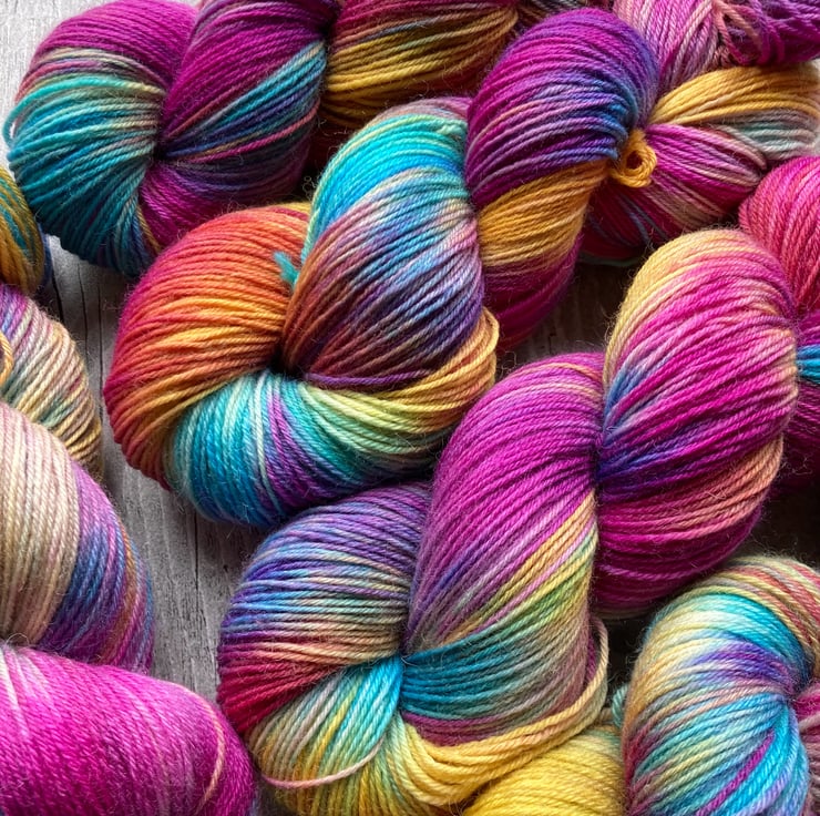 Skein of hand dyed yarn 75/25 merino nylon that has bounce and beauty and great for socks, shawls, mitts or whatever takes your fancy.