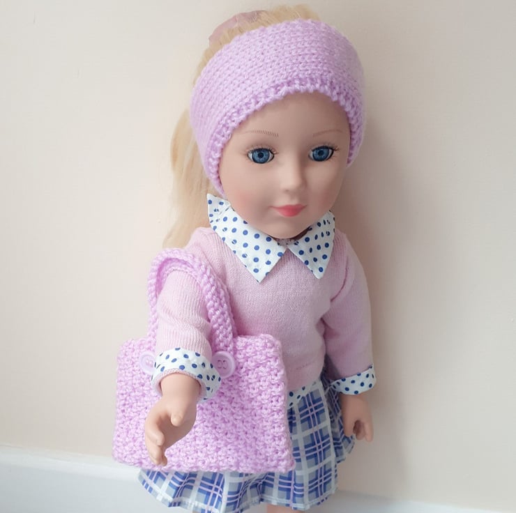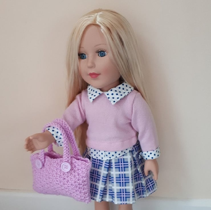 This hand knit PATTERN is for a bag for a Doll. To fit doll Height 46 cm or 18 inches. The bag is knitted in double knitting yarn using 3.25 mm knitting needles and is knit flat and seamed.