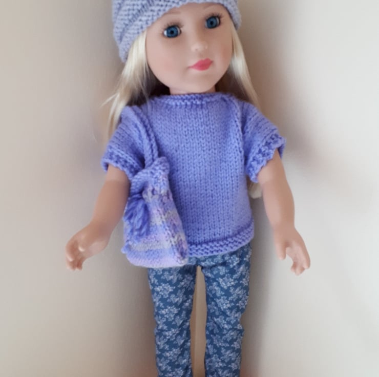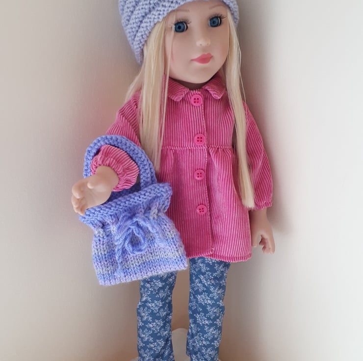 This hand knit PATTERN is for a bag for a Doll. To fit doll Height 46 cm or 18 inches. The bag is knitted in double knitting yarn using 3.25 mm knitting needles and is knit flat and seamed.