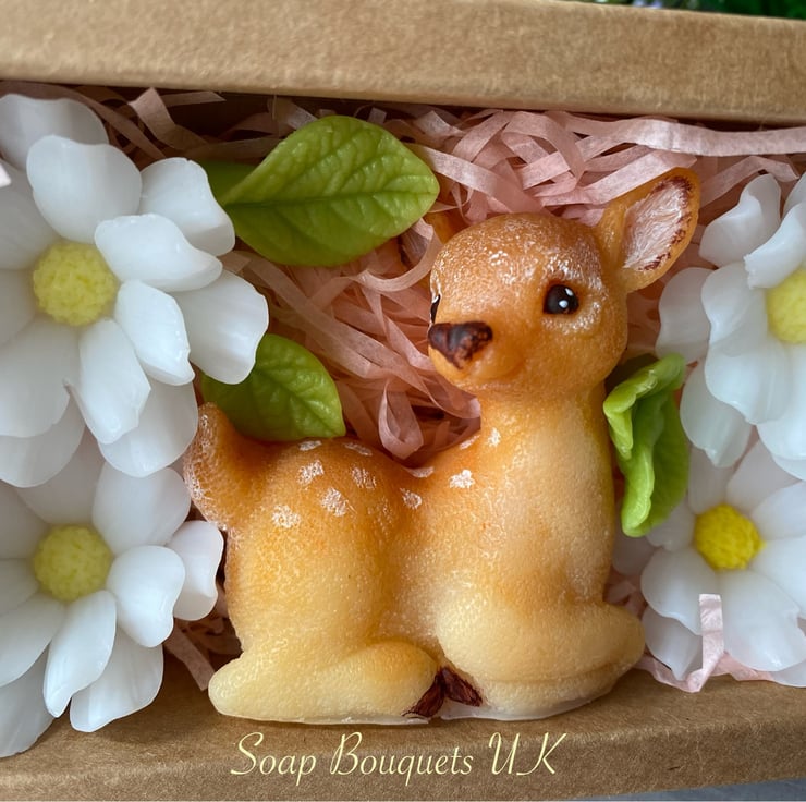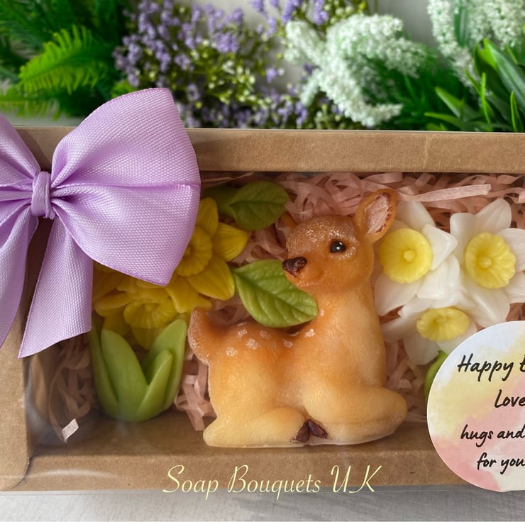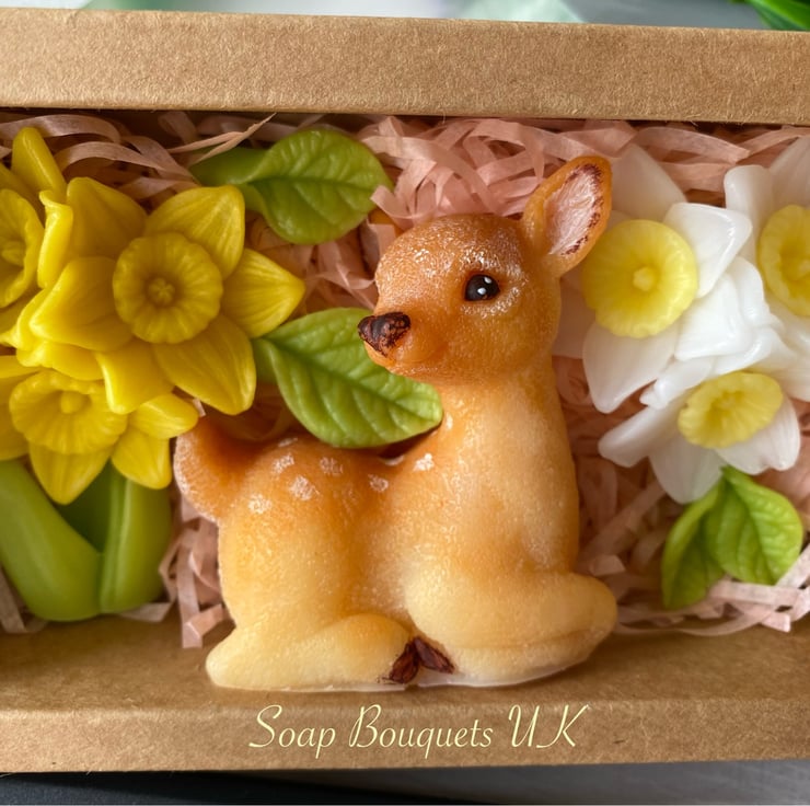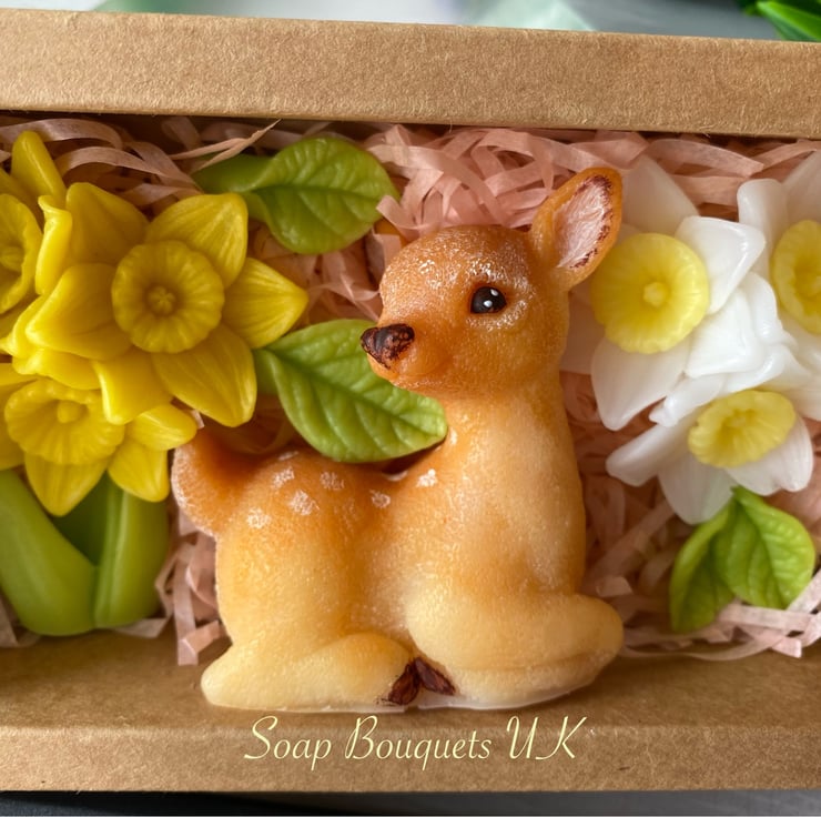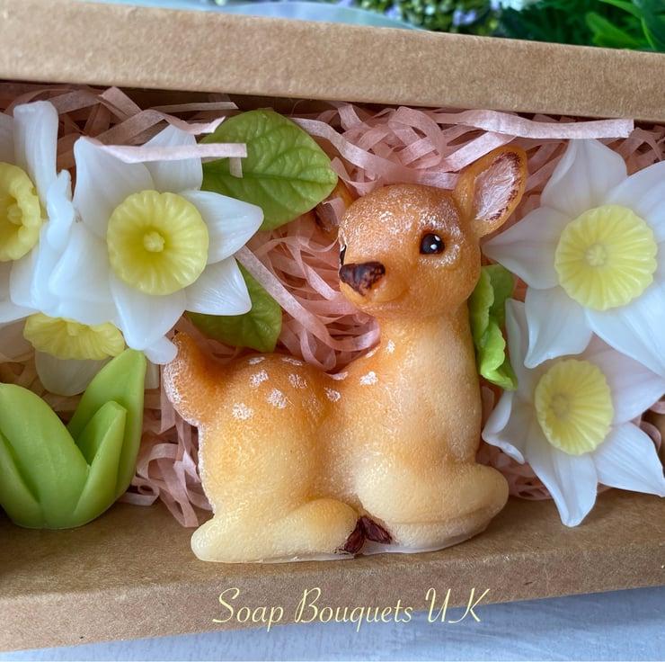 This delicate and lovely gift featuring a cute fawn and daffodils is a delightful alternative to traditional Easter sweets for both children and adults. It's also an excellent choice for birthdays or any special occasion.