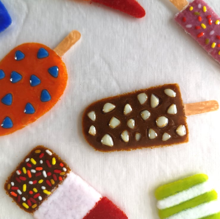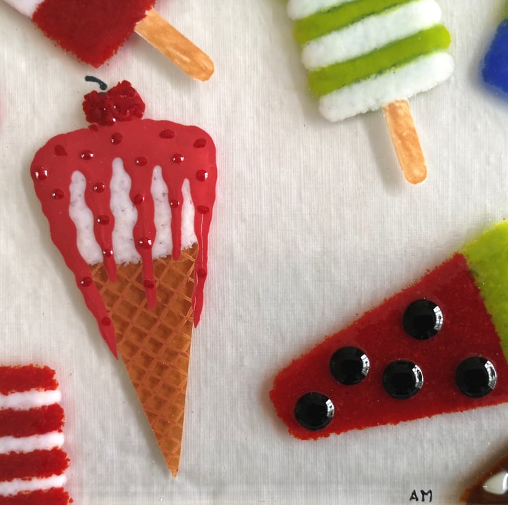 This picture has been made with extreme enthusiasm. It is almost a frenzy of colour and organised chaos. I endeavoured to squeeze in as many lollies as I could without making it too busy. I have used a variety of different glass types and techniques: glass sheet, glass stringers, frit, dichroic glass, and enamelling.