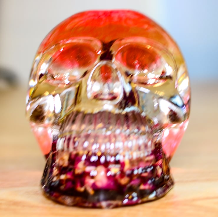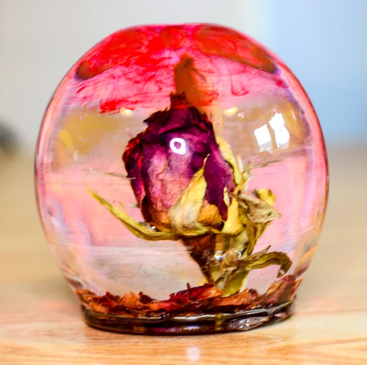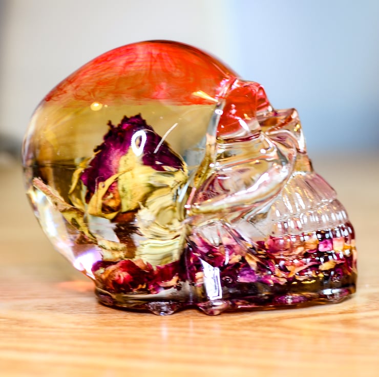 Blood Rose Resin Skull Ornament With Red Preserved Rose and Dried Rose Petals.