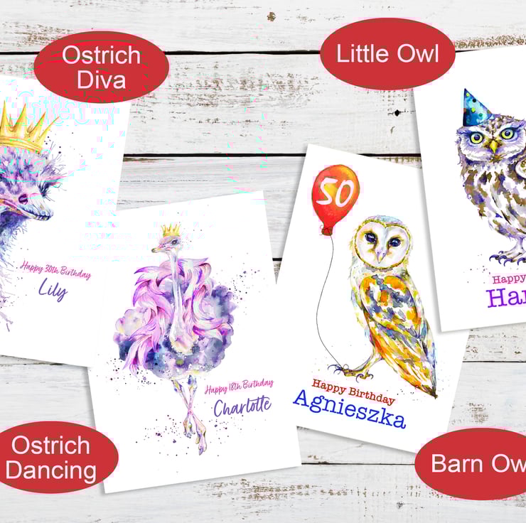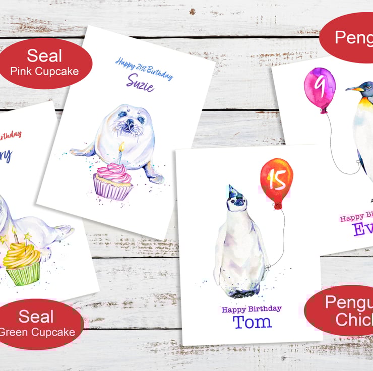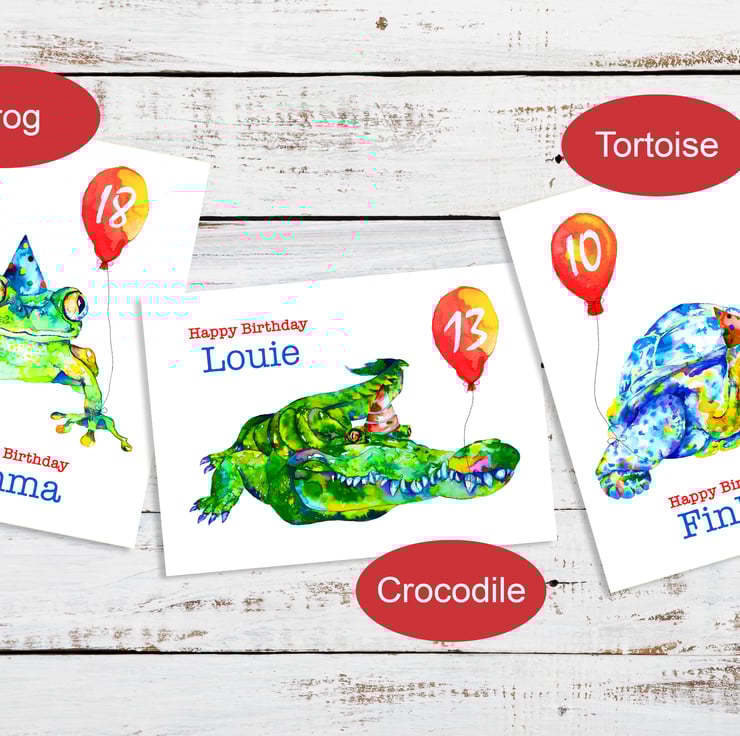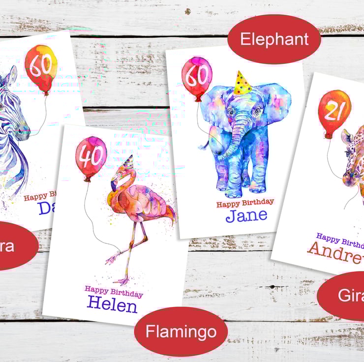 Fun fine art greeting cards, perfect for celebrating any birthday. My colourful animals cards can be personalised with any name and age.