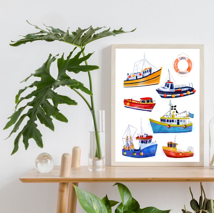 Cornish fishing boats art print from my original hand drawn illustration in a watercolour style.
