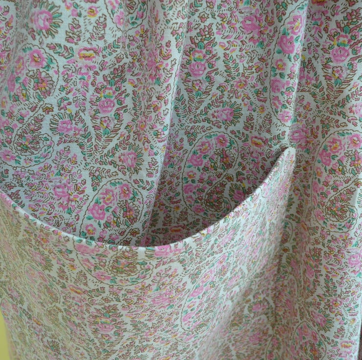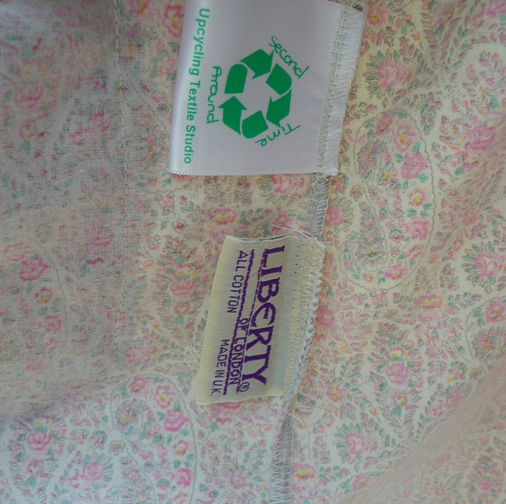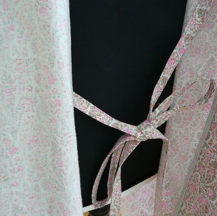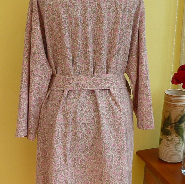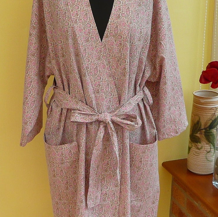 This one size bath robe kimono style dressing gown is made from a single vintage Liberty cotton duvet cover. The fabric is a medium weight Liberty cotton, ( NOT Tana Lawn ), the robe is wrap over style with a tie belt, patch pockets and an inside tie to help keep your robe closed. I have incorporated the original Liberty lable with the washing and care instructions on as well as my own brand lable.