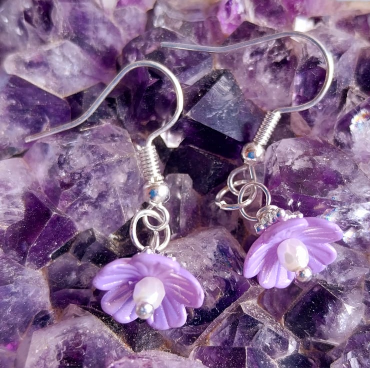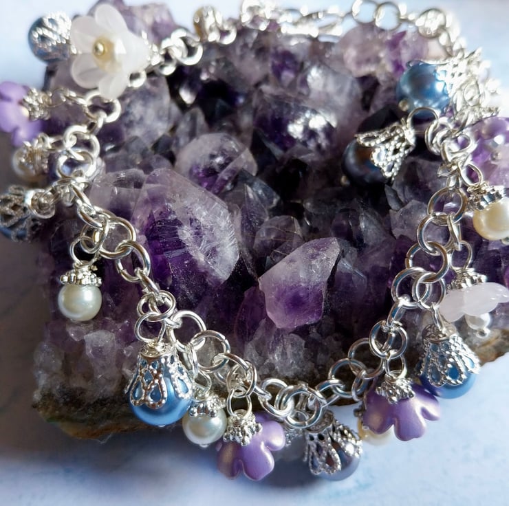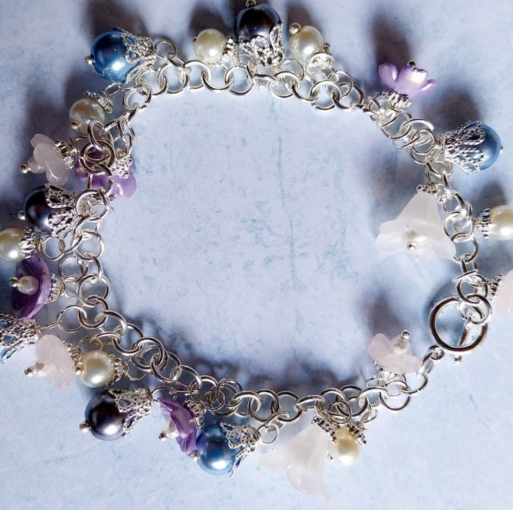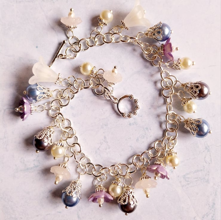 A handmade bracelet with silver plated findings, glass pearls and lucite flowers. A matching pair of earrings is included in the set. The bracelet measures approximately 19cm around excluding the toggle clasp.