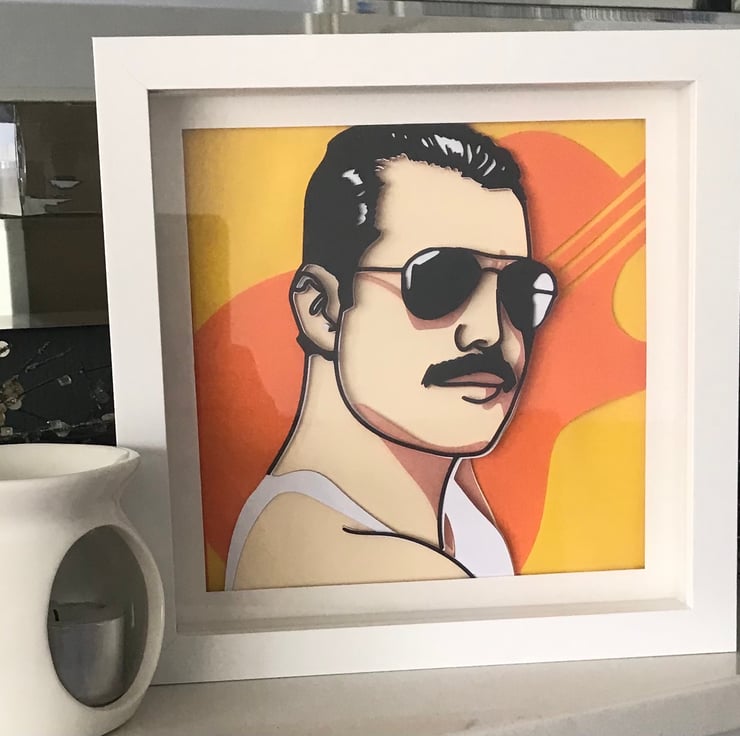 Calling all Freddie Mercury and Queen rock music lovers! The shadow box frame is 20cm x 20cm and can be wall mounted or freestanding. A perfect gift for lovers of rock music.