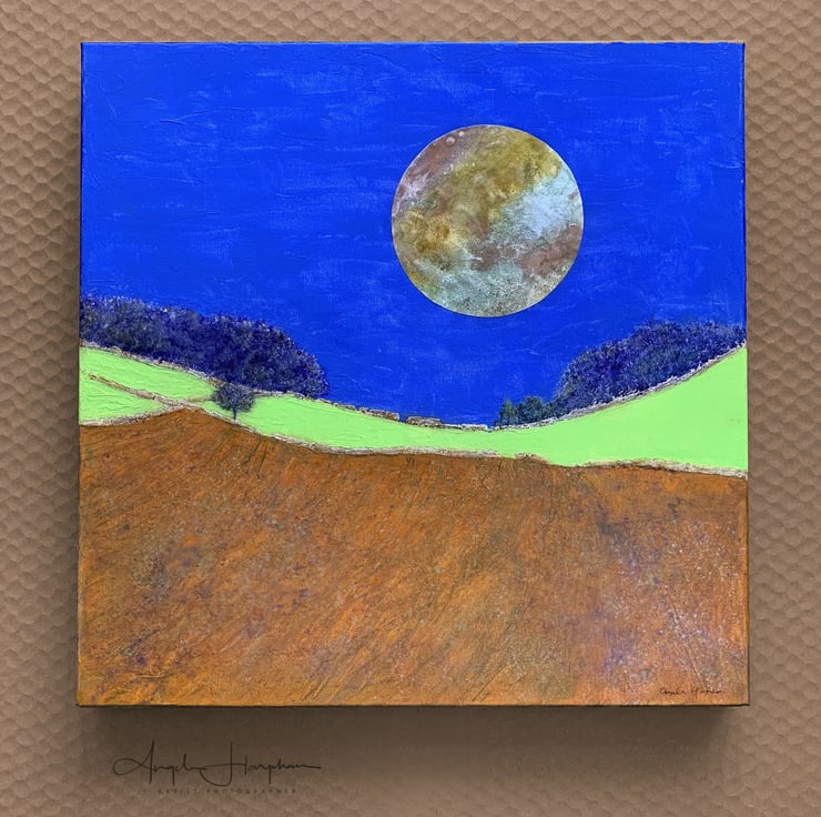 I love this view from a couple of my windows and wanted to paint it at dusk and limit myself to a three colour scheme. It has a collaged moon painted in iridescent watercolours.