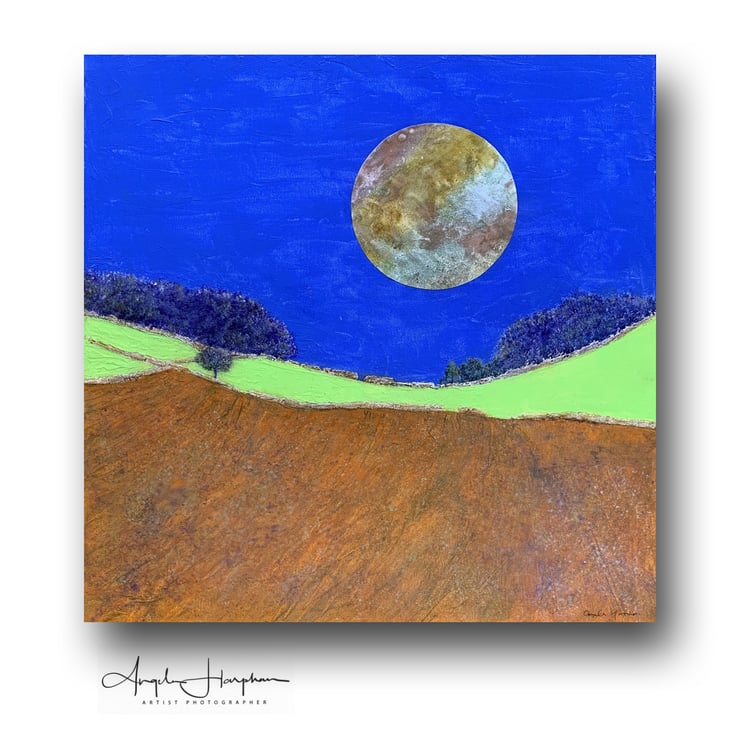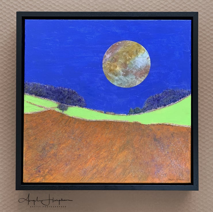 Acrylic painting on canvas float framed in black without glass to set off this vibrant painting on canvas. The work is of a distant view from our house with collaged moon, and the title is based on a poem by Rumi. A lovely statement piece. It has been varnished to protect it and can be lightly damp dusted.