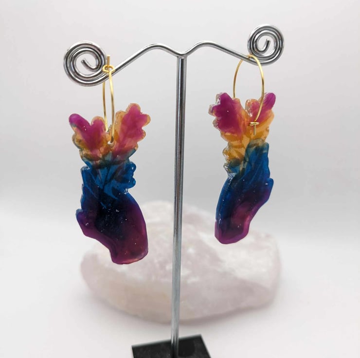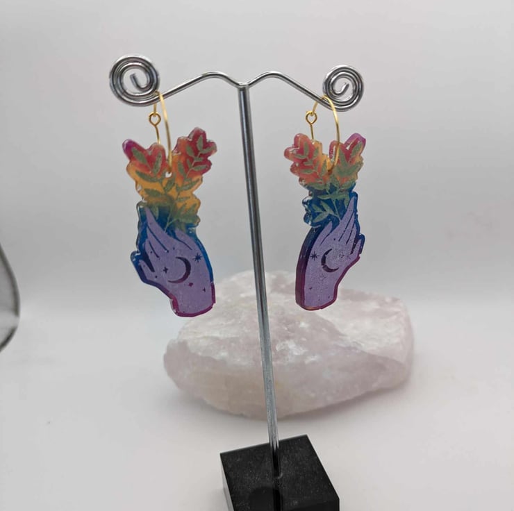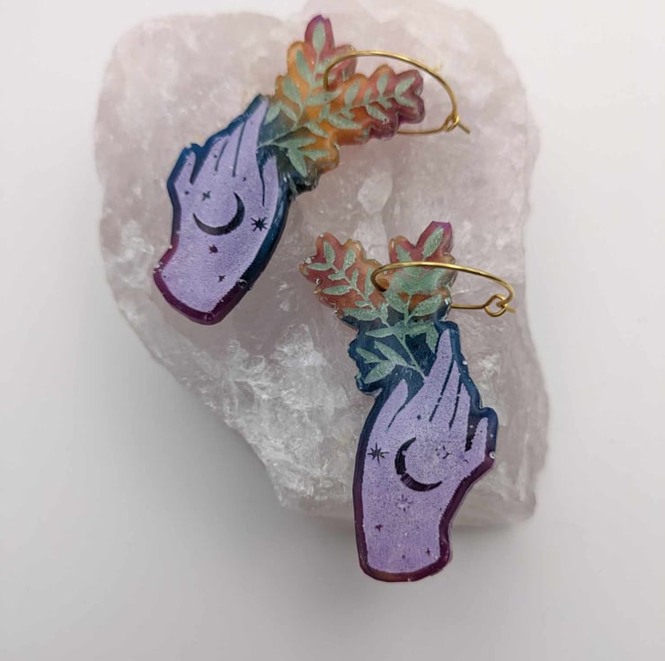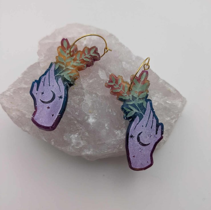 Embrace your inner mystic with these Witchy Hand hoop earrings. These unique resin earrings feature hands adorned with celestial symbols and botanical leaves, creating a whimsical and mystical vibe. With transparent colours, in an ombre design, and a floral pattern, add a touch of whimsy to any outfit, perfect for those who love alternative and mystical jewellery.
