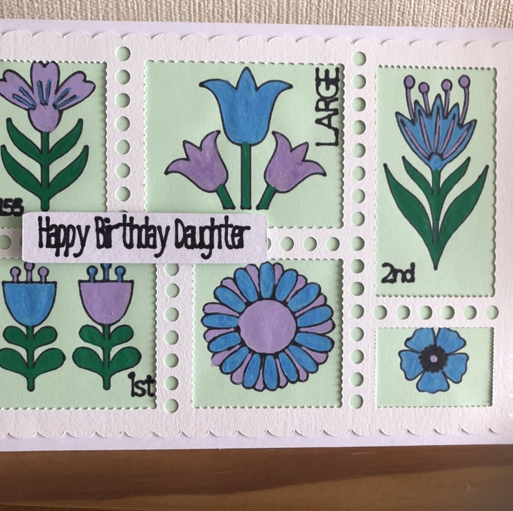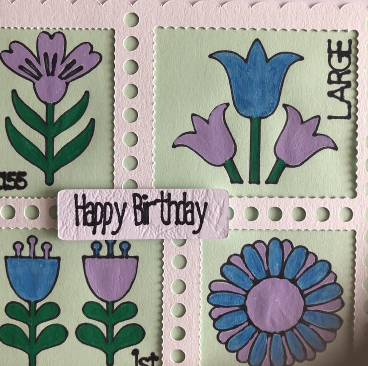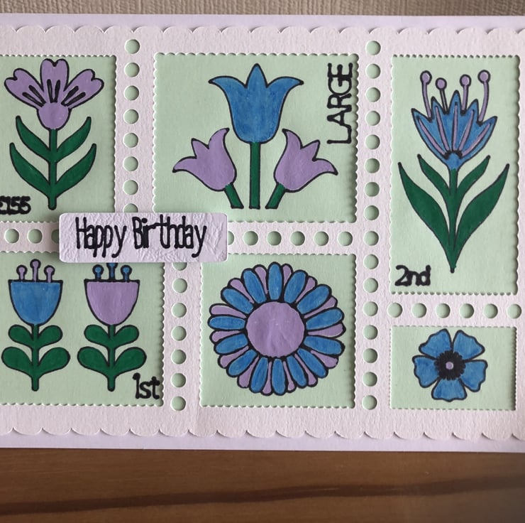 This beautiful card has been created using pen and acrylic, making each one a unique piece of art. The postage stamp style frame has been cut from textured card to make it stand out.